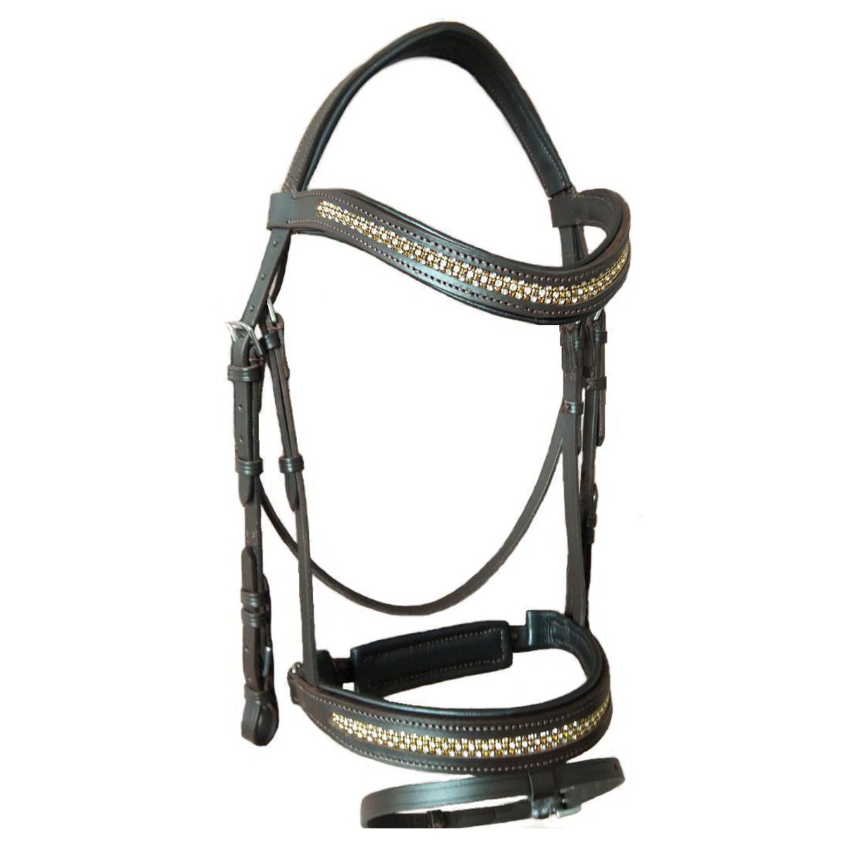Оголовье из высококачественной натуральной кожи (Leather Bridle) с самозатягивающимся капсюлем и изогнутым налобником. Мягкая подложка на капсюле, затылочном и налобном ремнях делает уздечку комфортной даже для чувствительных лошадей. Капсюль и налобник украшены стразами (украшения могут отличаться от фотографии на сайте). Кожа высокого качества и фурнитура из нержавеющей стали обеспечат долгую службу уздечки. Затылочный ремень анатомической формы. Фурнитура золотого цвета.