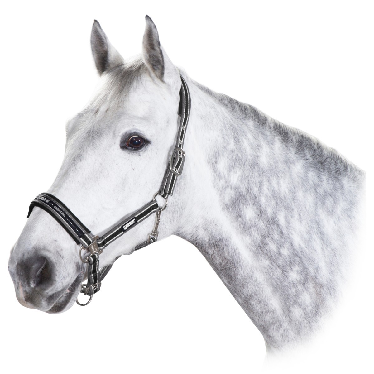 Высококачественный недоуздок из прочной тесьмы с двойной обработкой Затылочный и подбородный ремни регулируются, на ремнях мягкая подложка, препятствующая натиранию. Недоуздок легко снимается и надевается благодаря карабину. Фурнитура серебристого цвета с латунным покрытием.