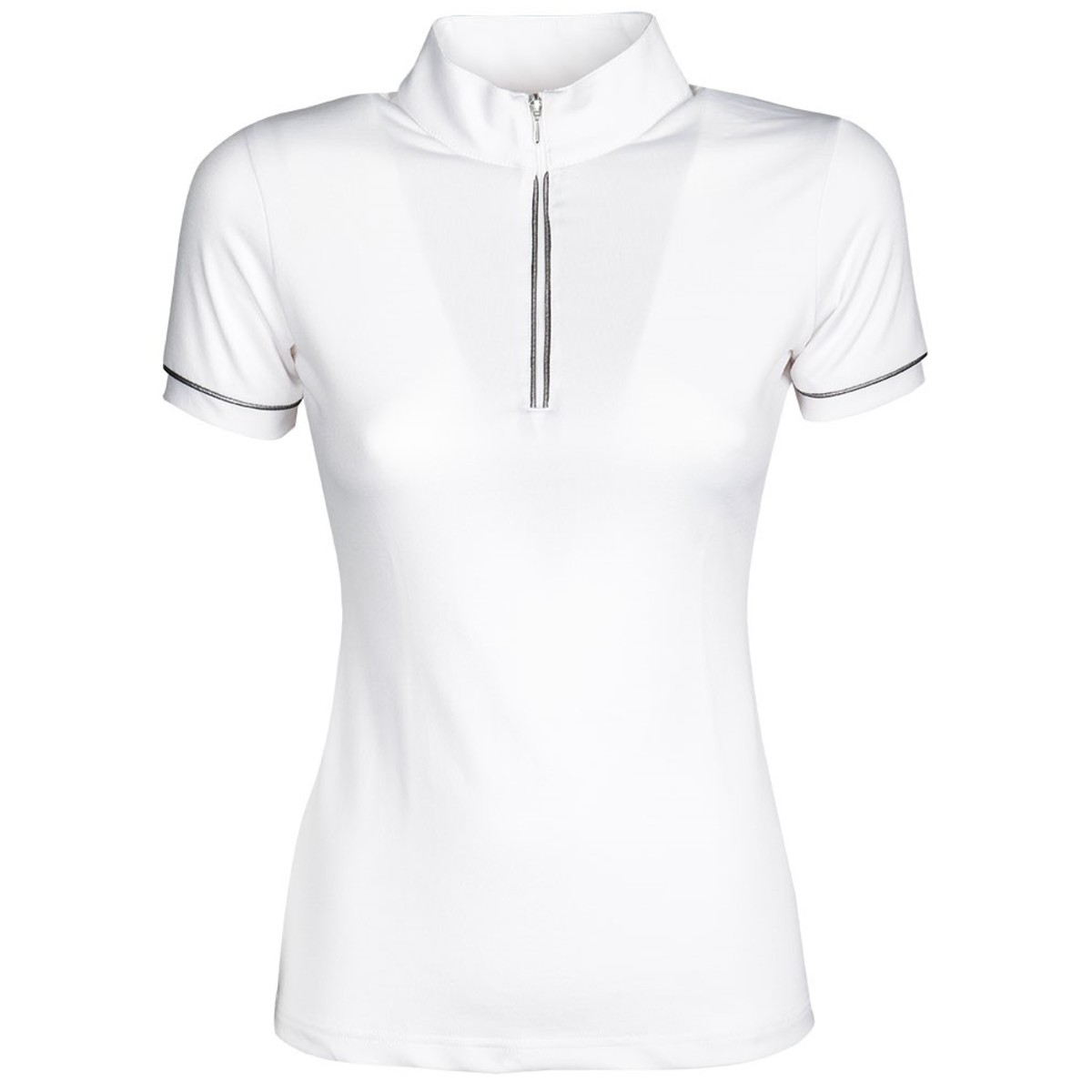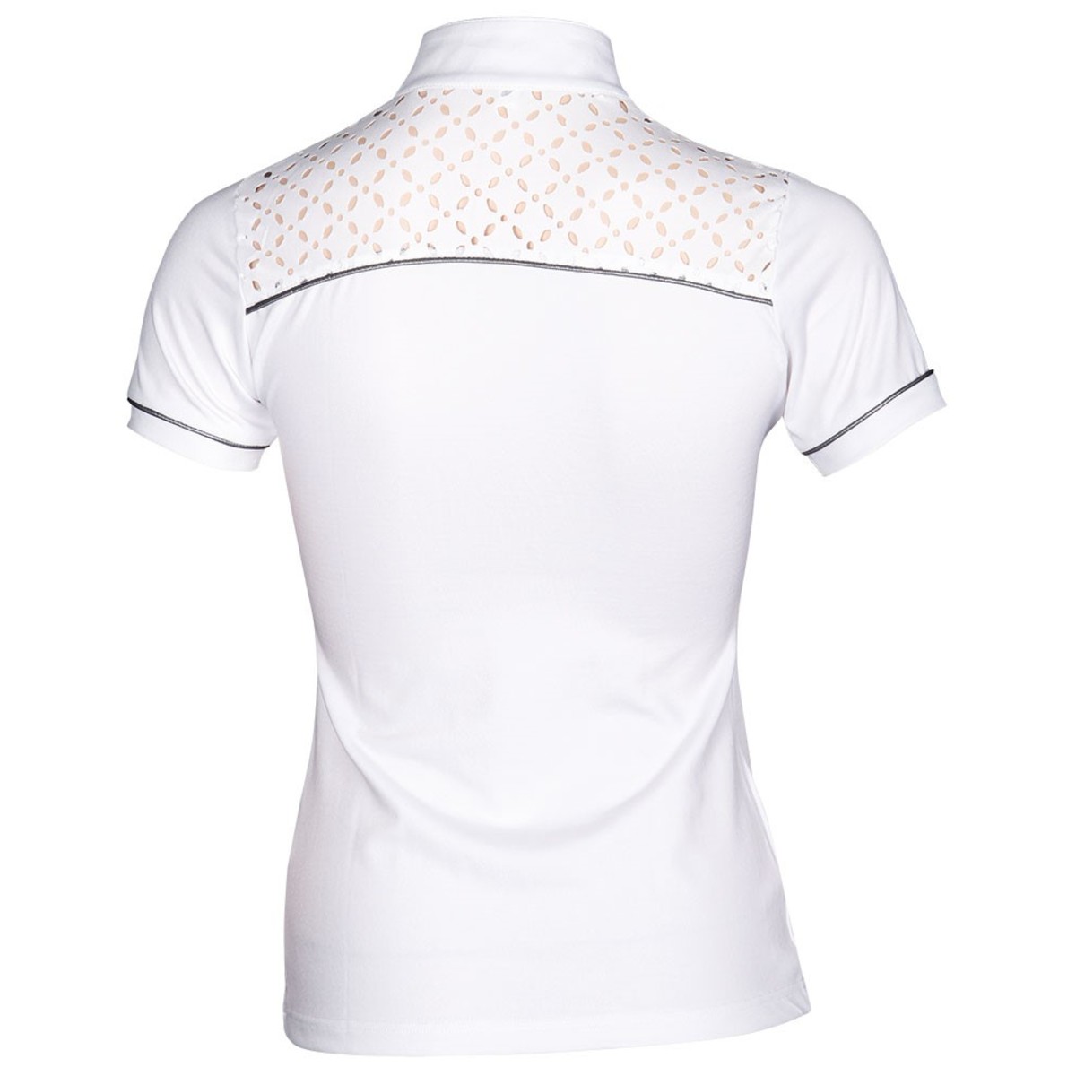 Рубашка для соревнований (Competition Shirt) с короткими рукавами, белый воротник-стойка с короткой молнией с серебряной окантовкой, серебряная окантовка на рукаве и спине, верх спинки перфорирован