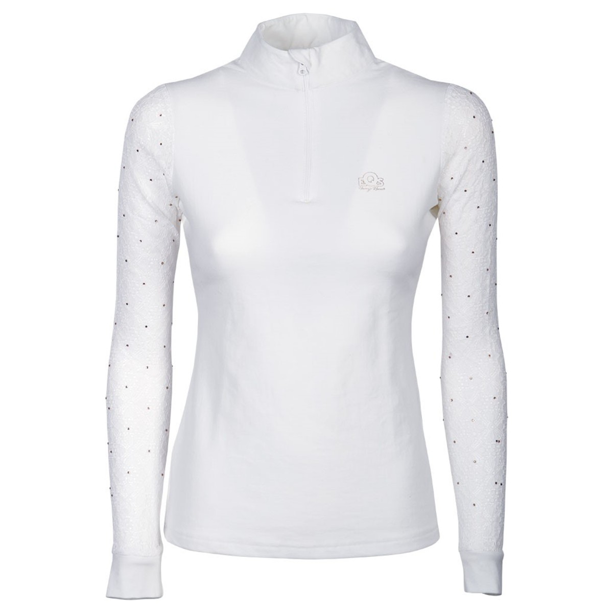 Элегантная блуза для выступлений (Competition Shirt) с приталенным силуэтом, длинным рукавом из кружева и воротничком-стойкой. Блуза выполнена из эластичной лёгкой ткани. Рукав по всей длине украшем камнями золотого цвета. Спереди застегивается на короткую молнию. На груди логотип EQS золотого цвета.
