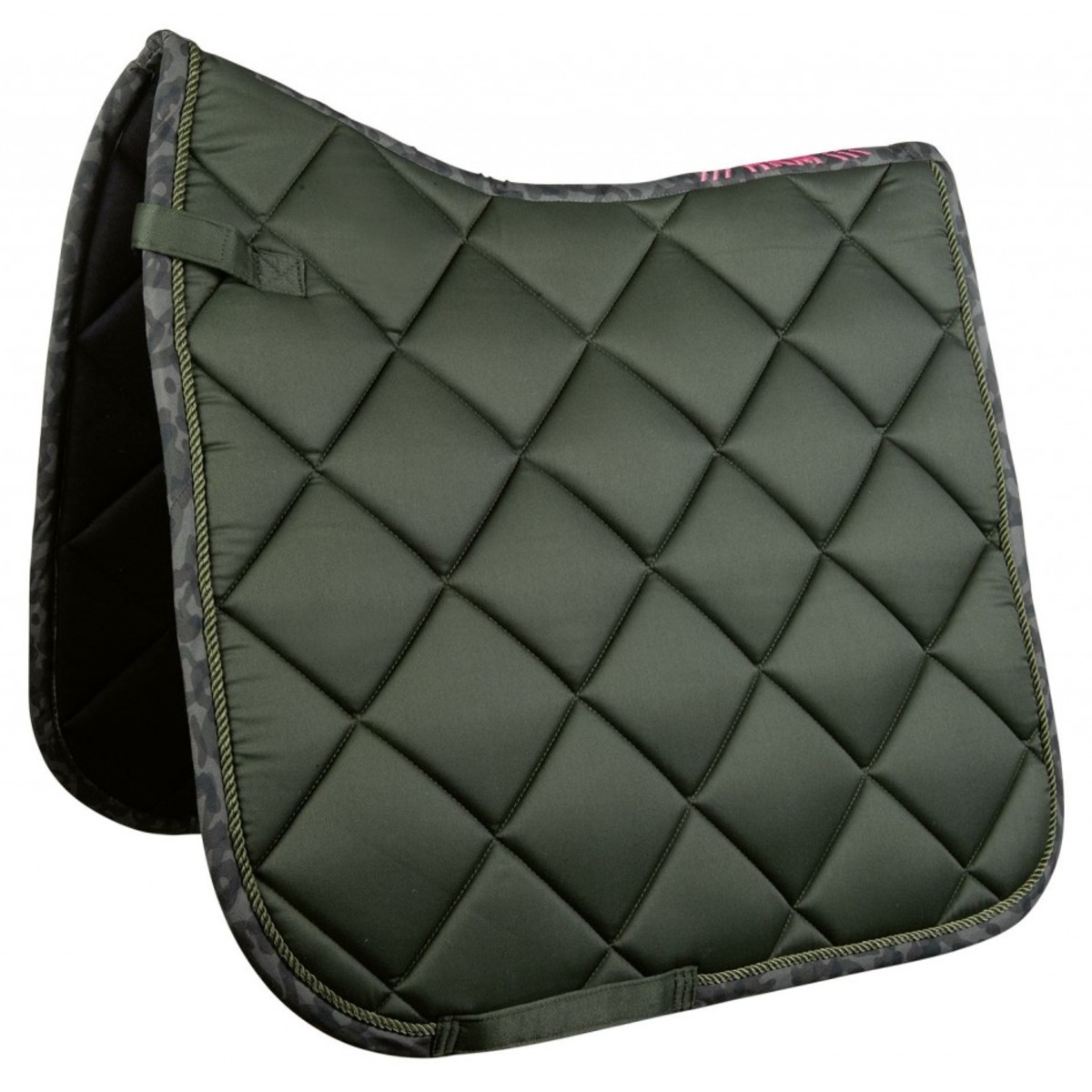Универсальный вальтрап (All-Purpose Saddle Pad) анатомической формы. Дышащая сетчатая подкладка гарантирует превосходное поглощение влаги. Наполнитель из поролона и синтепона делает вальтрап объемным, что очень важно для амортизации. Вальтрап из красивой ткани, украшен декоративным шнуром и окантовкой камуфляжного цвета. На спинке вышивка контрастного розового цвета.