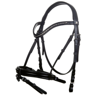 Оголовье трензельное из натуральной кожи (Leather Bridle) с самозатягивающимся капсюлем. Мягкие подложки на капсюле и затылочном ремнях делает уздечку комфортной даже для чувствительных лошадей. Налобный ремень украшен камнями. В комплекте с уздечкой идет тесьмяный повод с ограничителями и нашивками против скольжения.