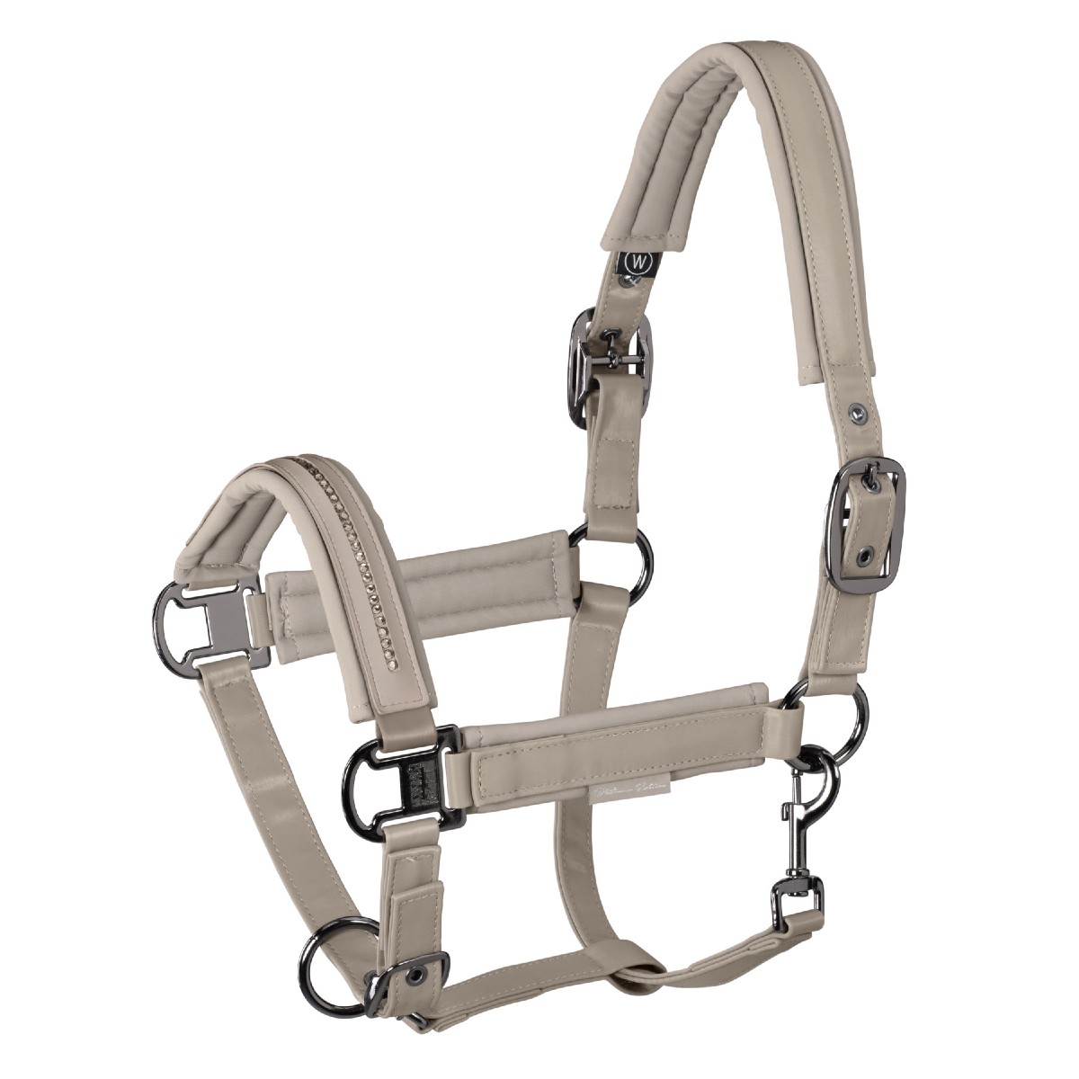 Затылочный и подбородный ремни регулируются, на ремнях мягкая подложка, препятствующая натиранию. Украшен стразами. Недоуздок легко снимается и одевается благодаря карабину. Металлическая никелированная фурнитура.