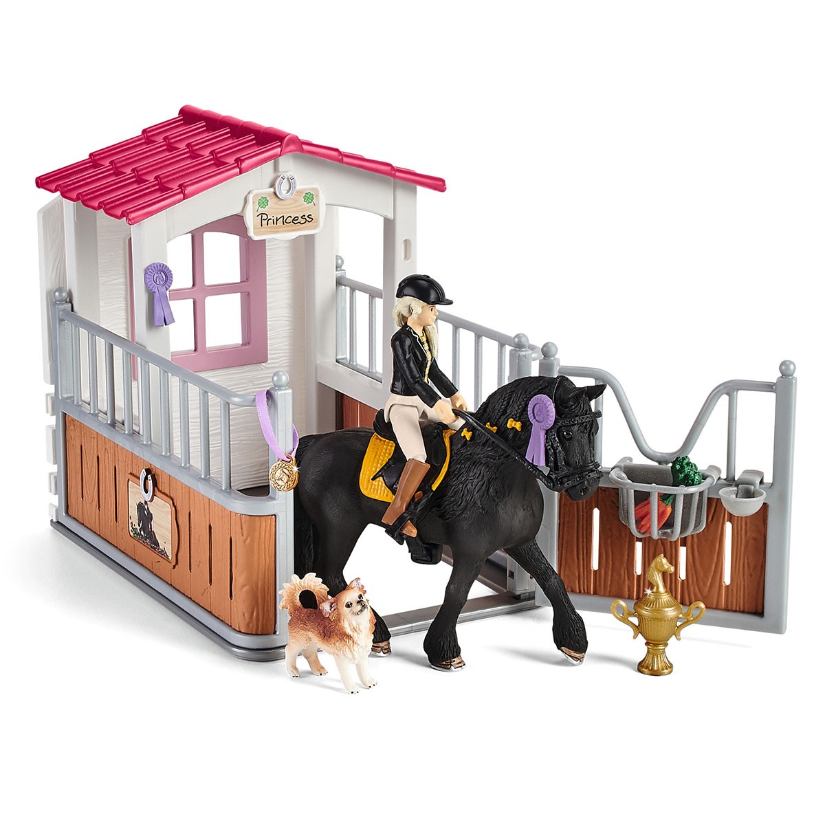 Маленькая уютная конюшня — идеальное место отдыха для великолепной кобылы фризской породы, Принцессы. Владелицей которой является белокурая Тори. Конюшня оснащена необходимыми удобствами для лошади. Там есть поилка, кормушка, удобное стойло. Крыша и дверца легко снимаются, трансформируя конюшню. Маленький домик можно украсить красивыми наклейками, которые входят в комплект. Фигурка Тори может стоять, сидеть на лошади и держать поводья.