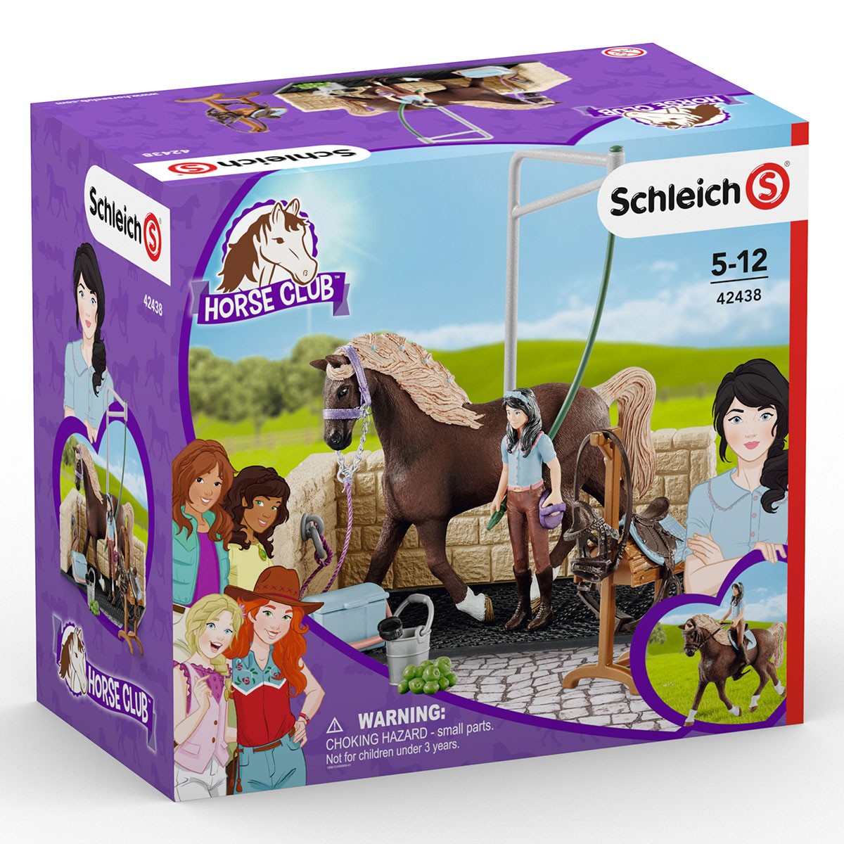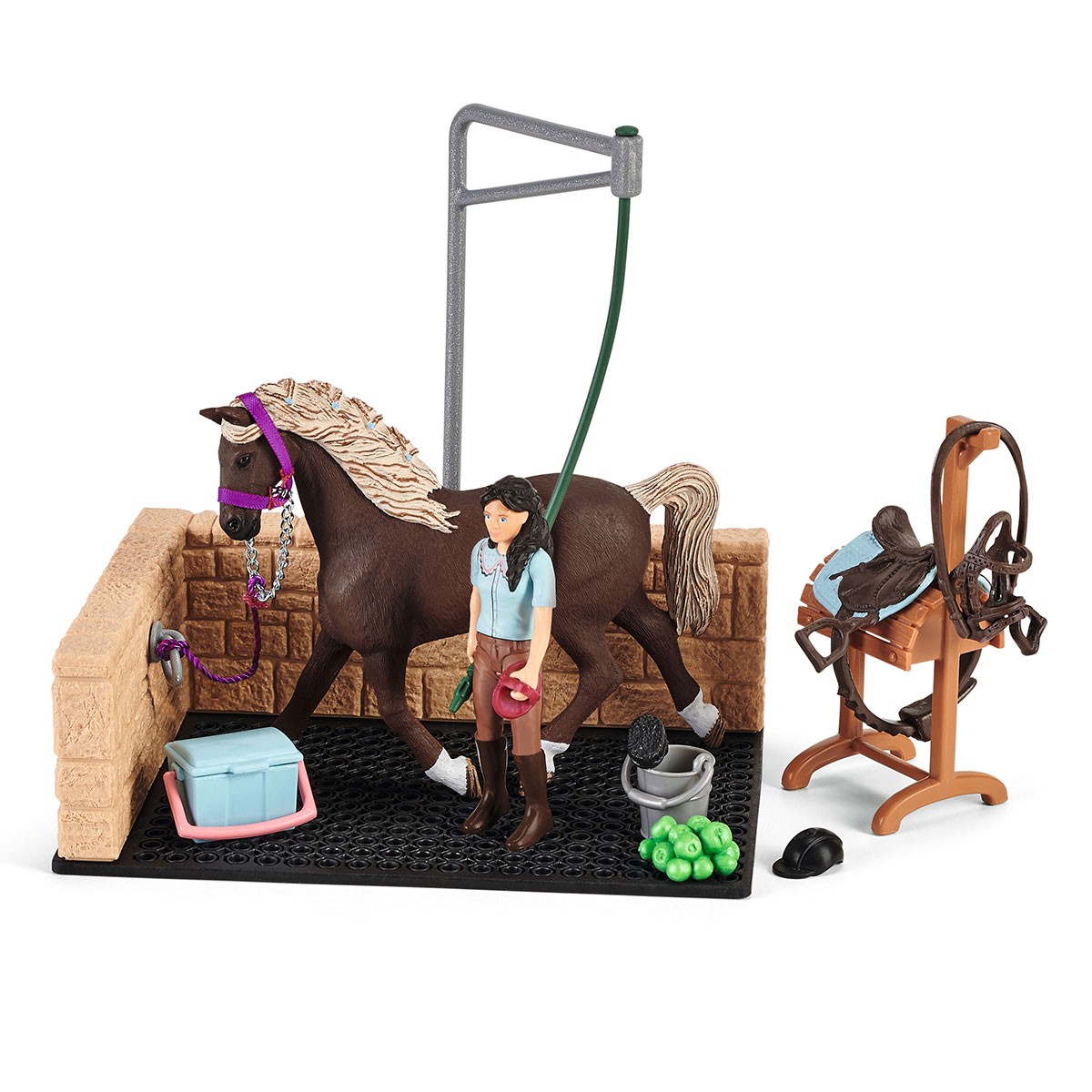 После жарких соревнований необходимо расслабиться и привести себя в порядок. Поэтому Эмили ведёт свою кобылу Луну на специальную мойку для лошадей! Там она без проблем снимет всё обмундирование Луны, которое оставит на удобном деревянном ленчике. А потом можно отправиться в конюшню спать. Фигурка Эмили может стоять, сидеть на лошади и держать поводья.