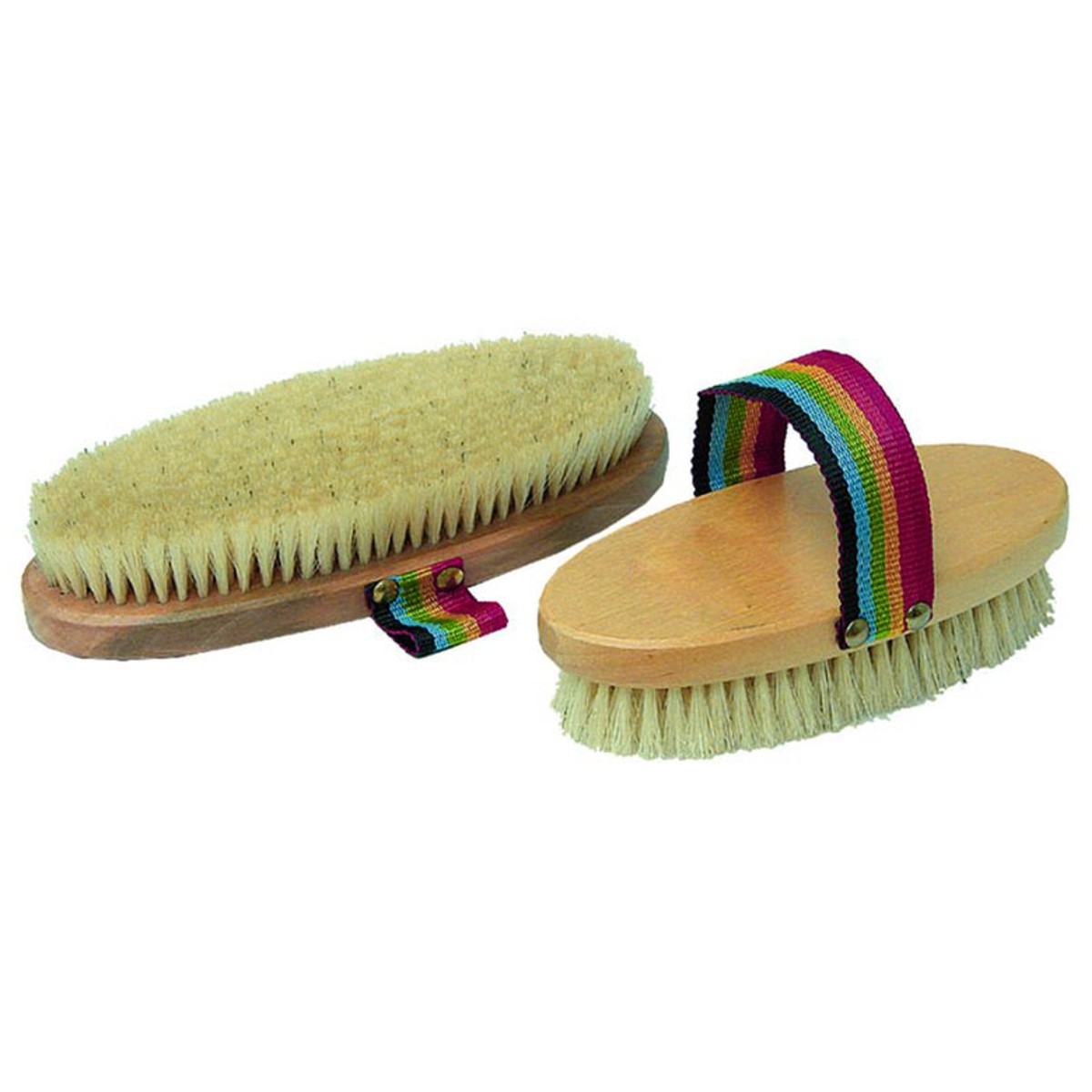 Щётка с натуральной щетиной на деревянной основе. Обладает необычайной мягкостью. Благодаря мягкой структуре не травмирует и не выдирает шерсть. Подходит для бережной чистки морды лошади. Удобный цветной ремешок для фиксации на руке.