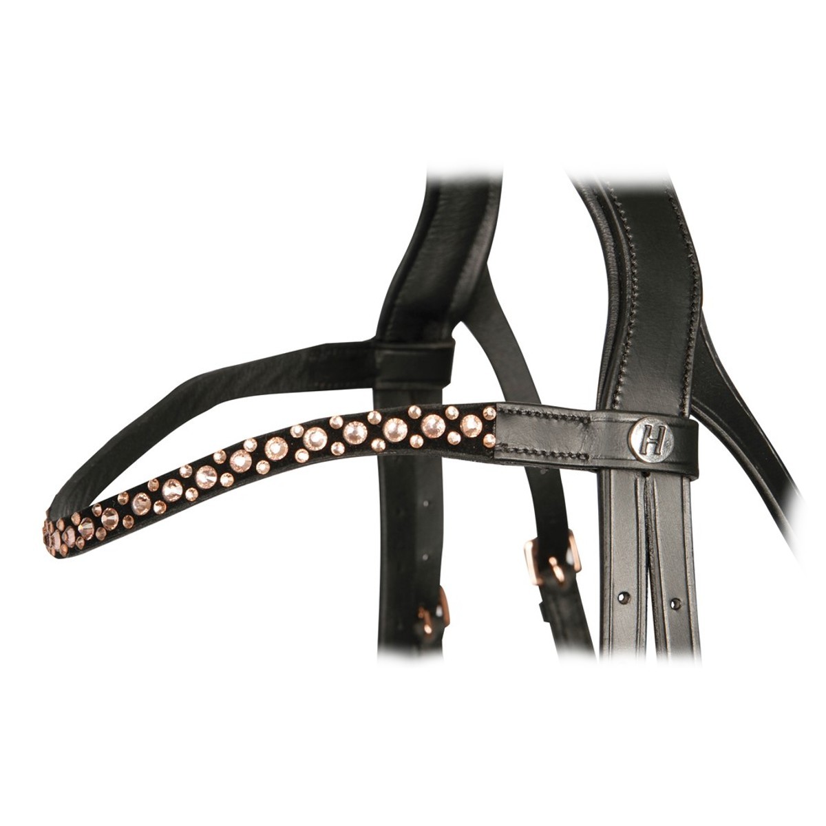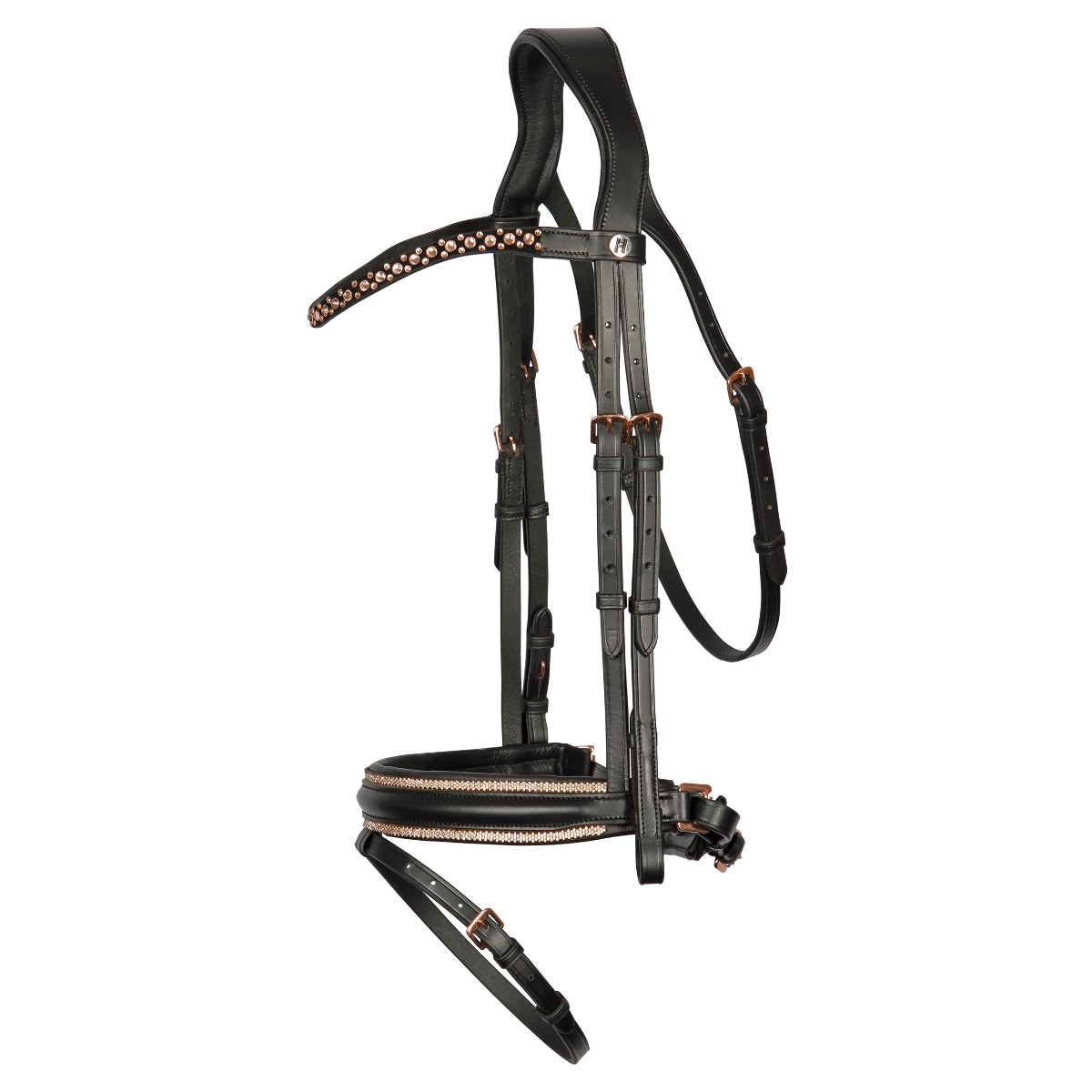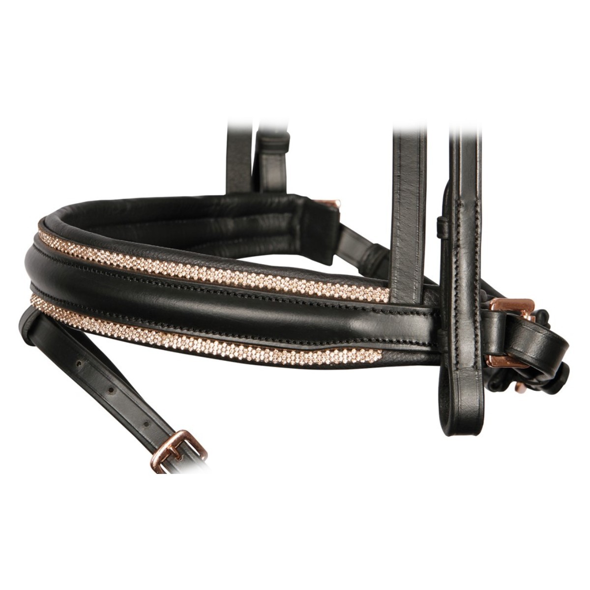 Роскошная уздечка с мягкой подложкой и капсюлем. Капсюль имеет анатомическую форму и сужается у трензеля. Оснащена пряжками из розового золота и красивыми кристаллами также розового золота на налобнике и вдоль капсюля.