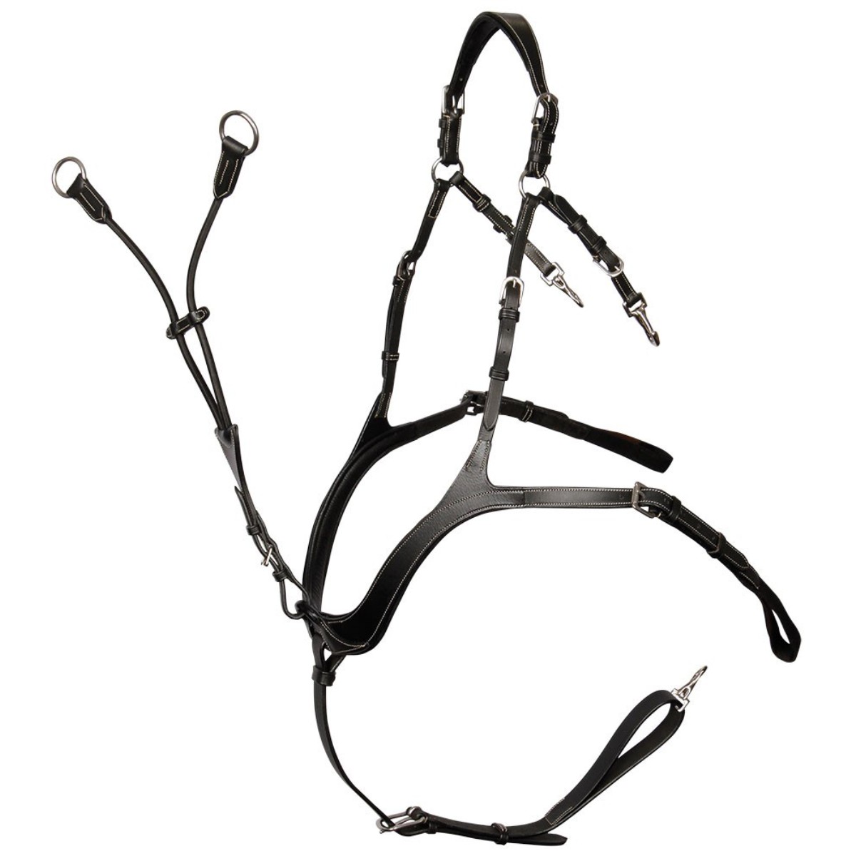 Подперсье с мартингалом (Breastplate Martingale) из натуральной кожи объединяет в себе две важных функции. Подперсье удерживает седло на месте, а мартингал стабилизирует положение головы и шеи. Декоративная отстрочка белыми нитками. Крепится на карабины.