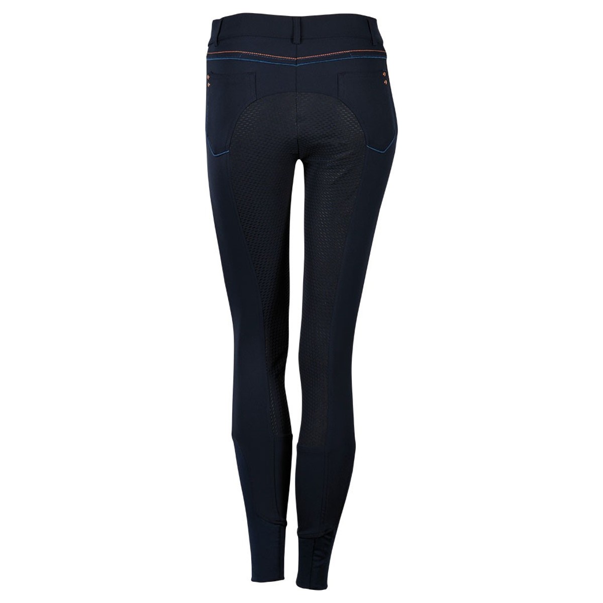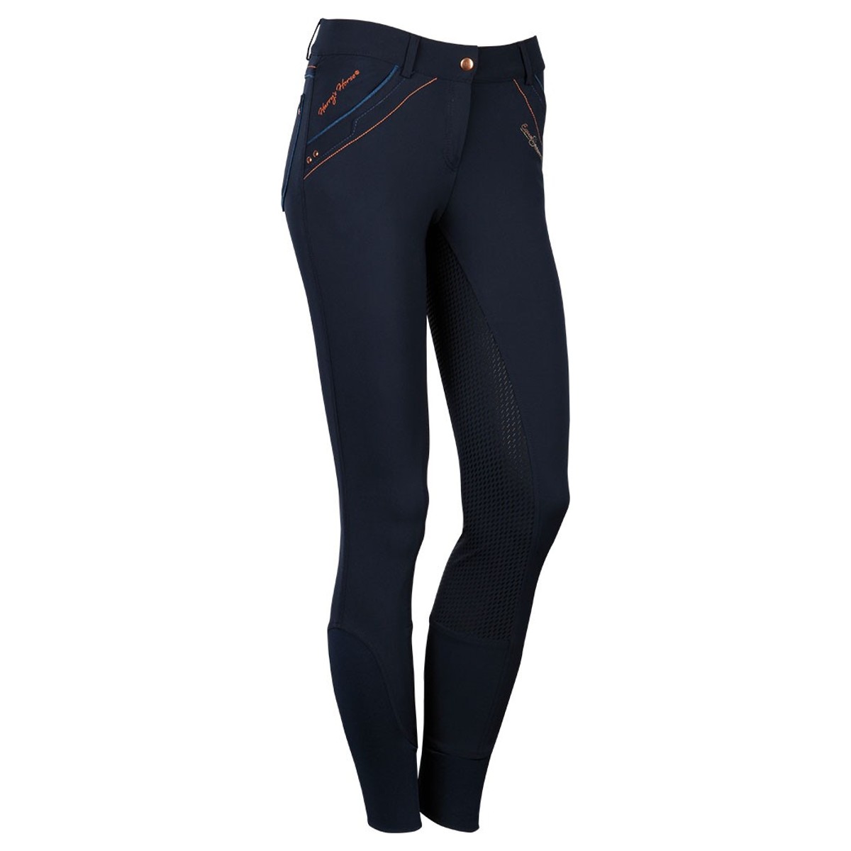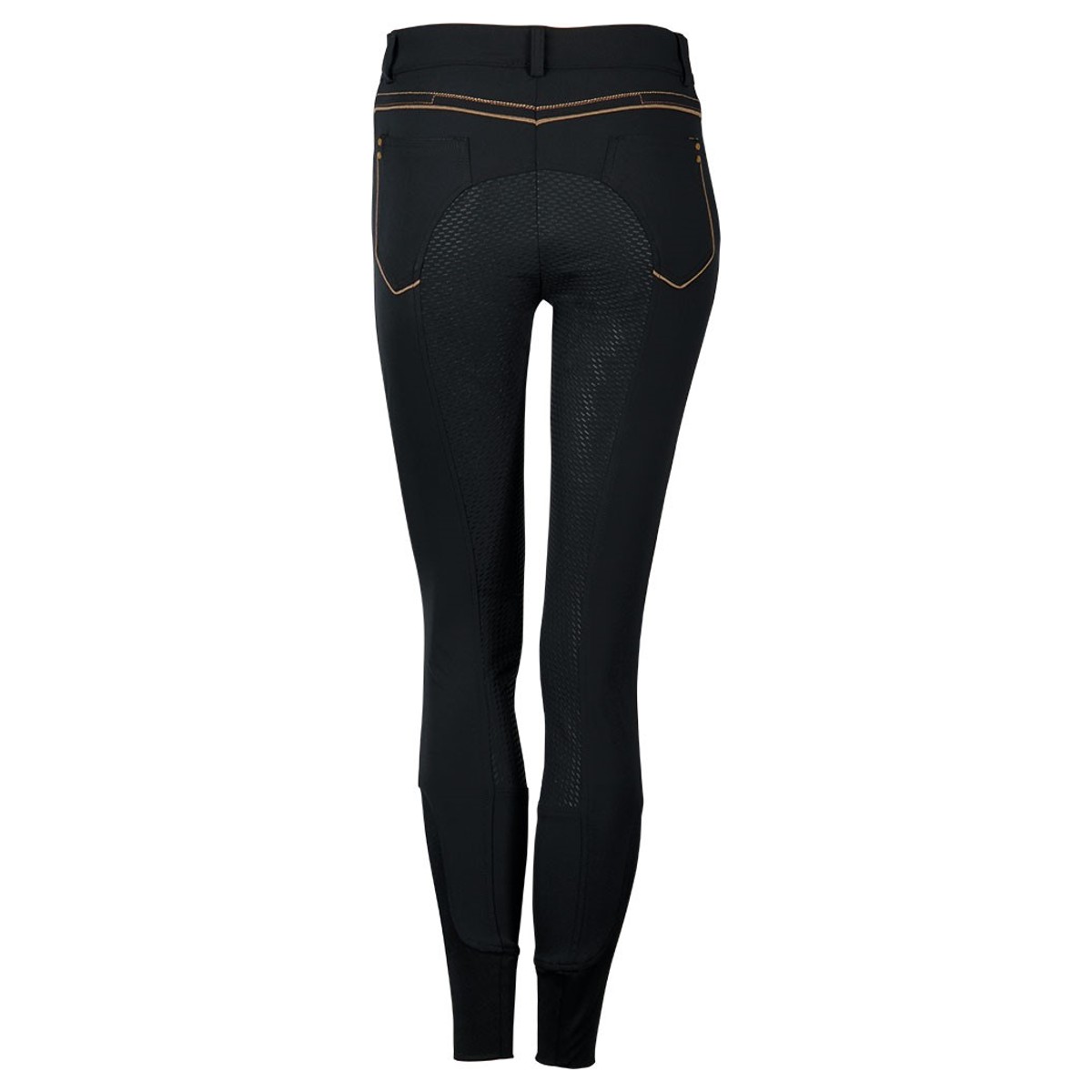 Леггинсы с полной силиконовой леей (Breeches with Silicone Knee Patch). Силиконовая лея предполагает отстутствие лишних швов в зоне колен и обеспечивает наибольшую фиксацию в седле. Материал комфортный для тела, "дышащий", эластичный. На поясе петли для ремня. Боковые и задние карманы с металлическими заклепками, контрастной строчкой и кантом украшенные кристаллами. В области щиколотки эластичная вставка.