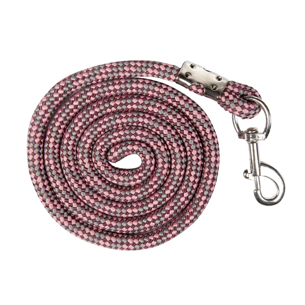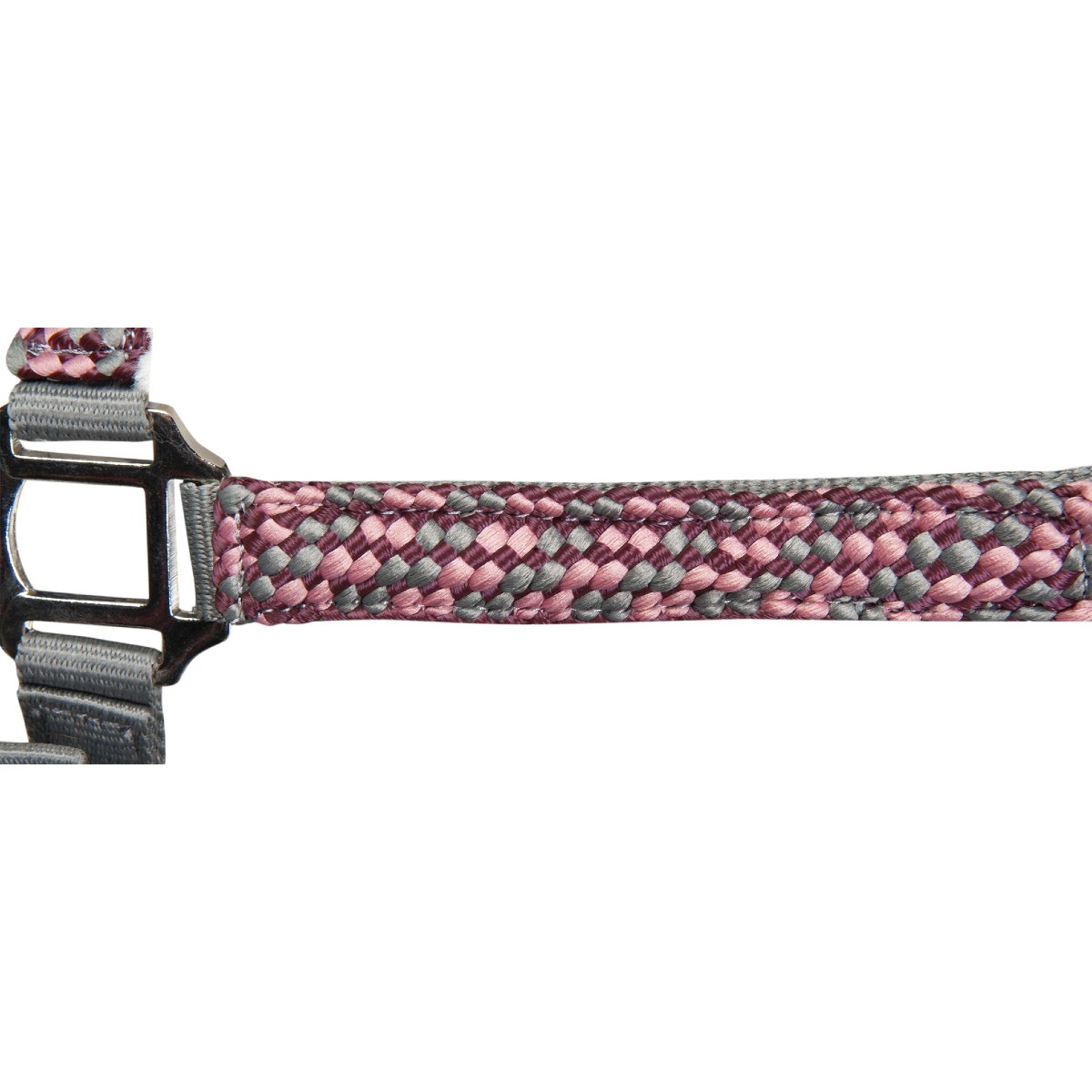 Затылочный ремень на недоуздке регулируется. На чумбуре длиной 1,8 м имеется простой карабин. Фурнитура серебристая.