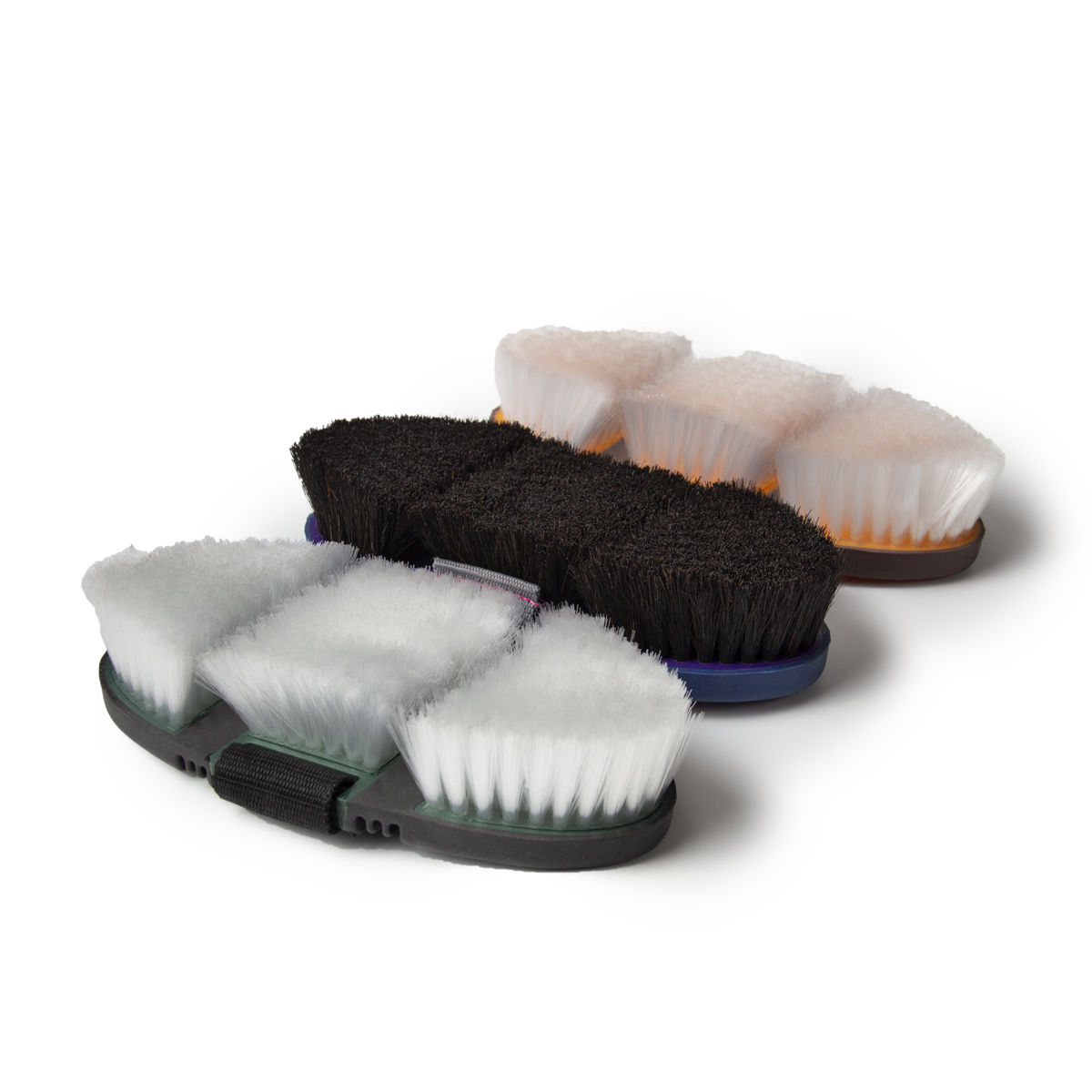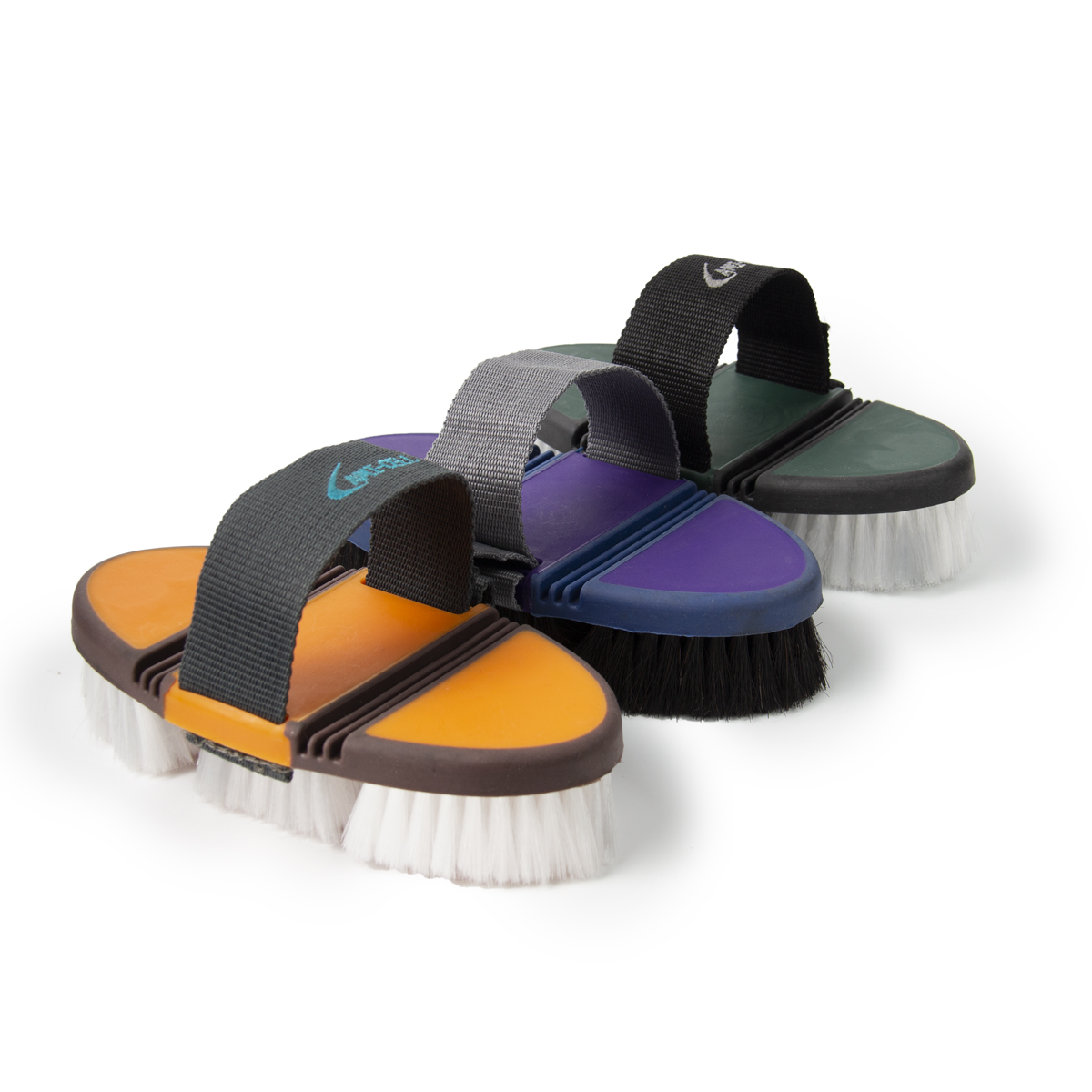Щётка с мягкой искусственной щетиной на гибкой основе (Plastic goat's hair brush flexible). Благодаря мягкой структуре не травмирует и не выдирает шерсть. Подходит для бережной чистки морды лошади. Удобный ремешок для фиксации руки.