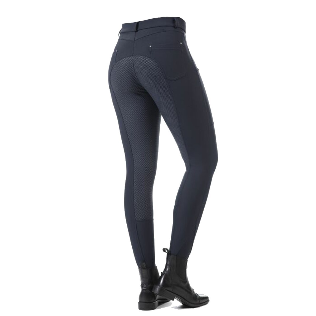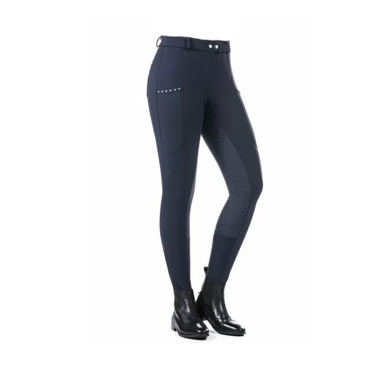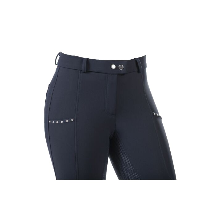 Бриджи зимние с флисовым подкладом (breeches with fleece lining) с полной силиконовой леей. Бриджи выполнены из ткани Softshell, "дышащей", легкой, ветронепродуваемой, водооталкивающей, грязеустойчивой. Также софтшелл - это эластичный и немнущийся материал, легкий в уходе. На поясе есть петли для ремня. Два передних кармана, украшенны стразами и два кармана сзади. Застёгиваются на молнию и брючный крючок. Внизу брючин эластичные вставки для удобства одевания. Материал верха выполнен их 76% нейлона и 24% эластана. Материал подклада выполнен из 85% полиэстера, 15% эластана.
