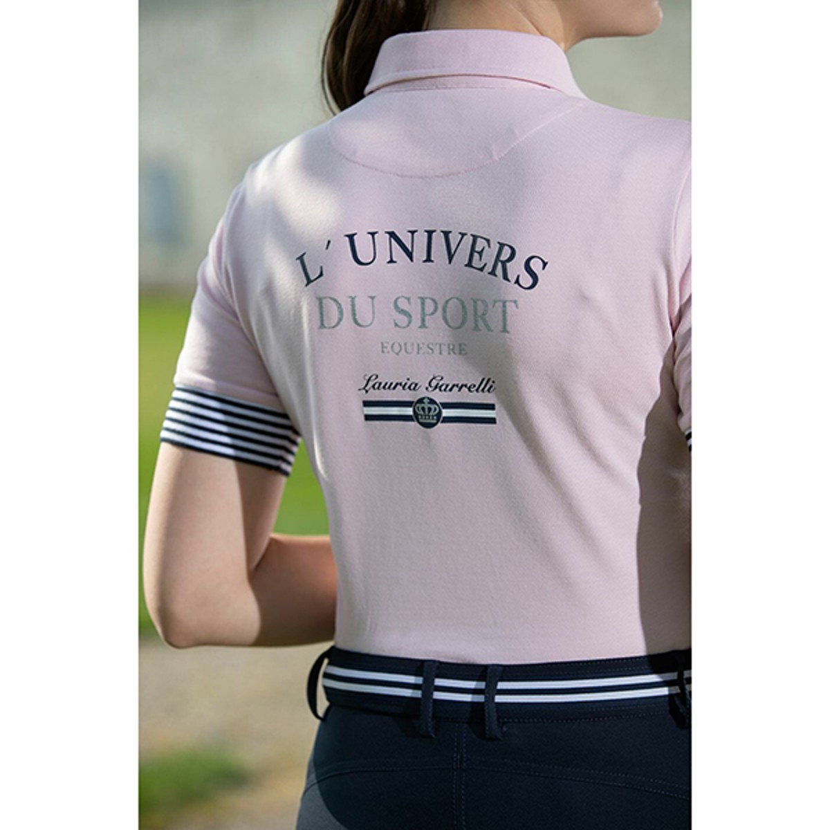 Традиционная рубашка-поло с коротким рукавом идеально подойдет для тренировок. Застегивается на пуговицы. На рукаве стильная манжета-резинка в полоску. На спине красивый принт с символикой бренда.