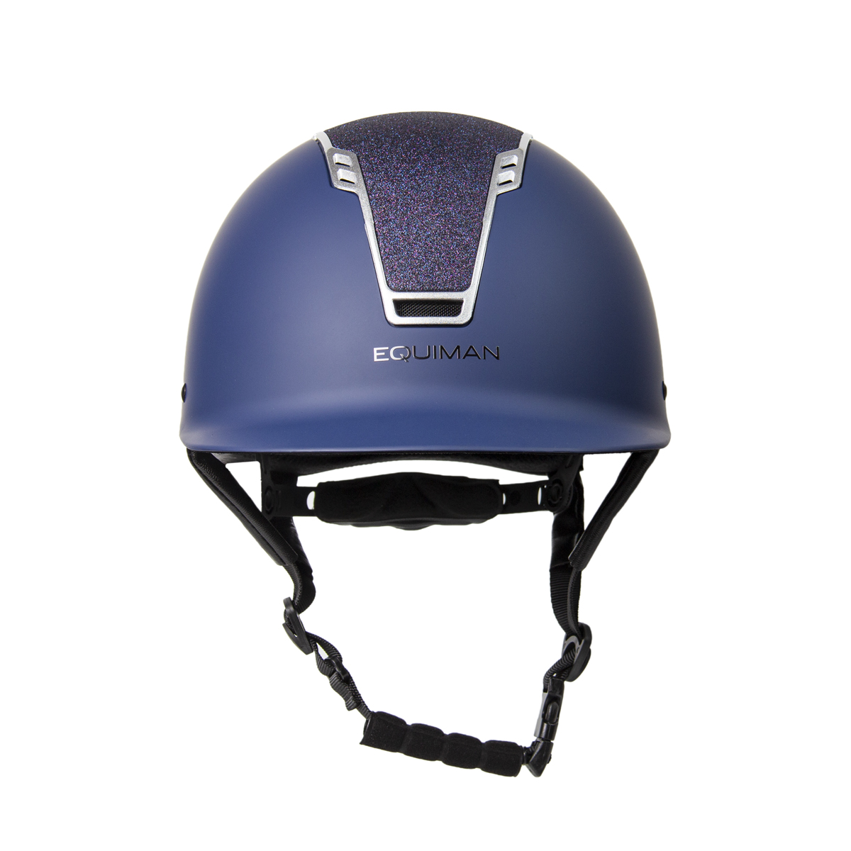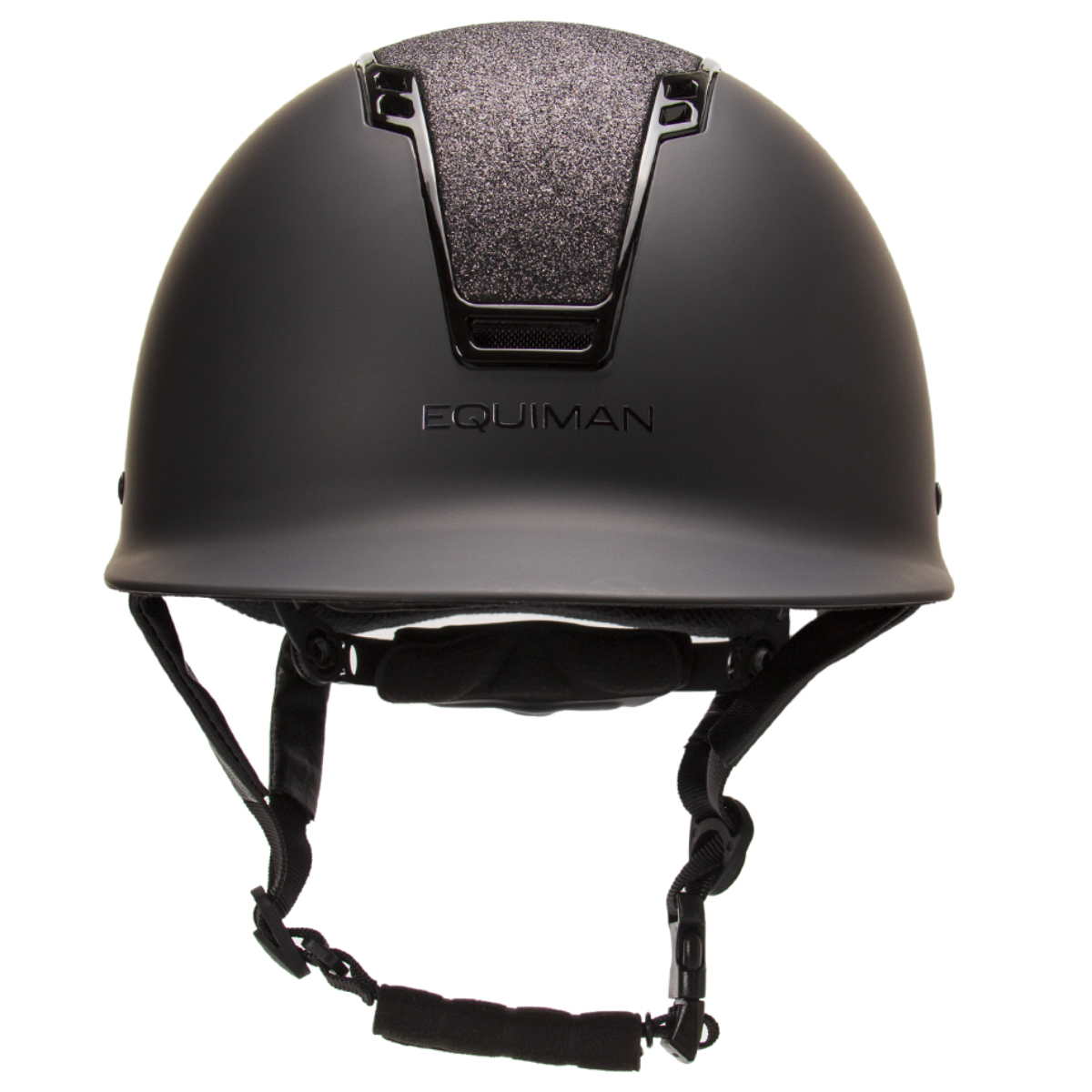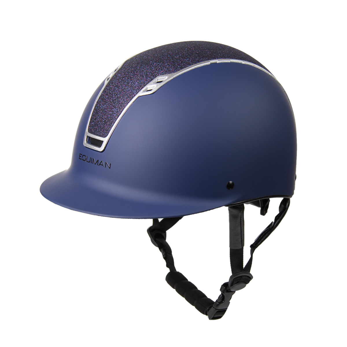 Шлем украшен блестящей вставкой черного цвета. По центру шлема надпись EQUIMAN.