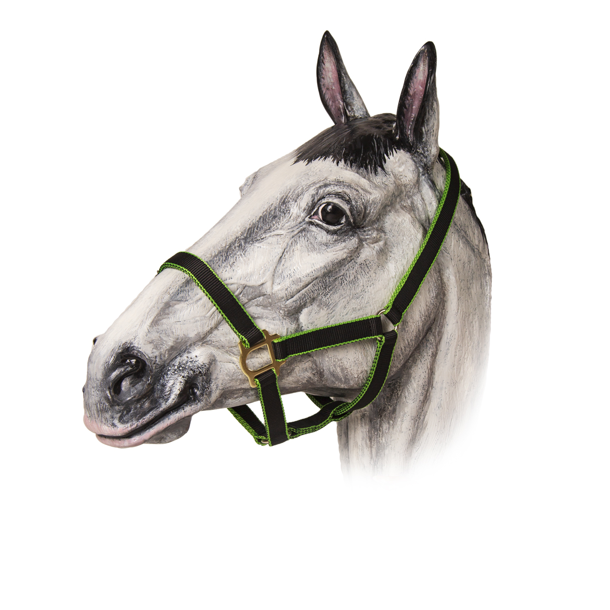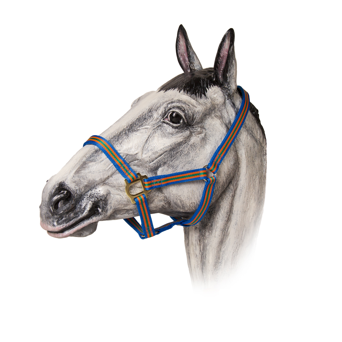 Прочный яркий недоуздок из высококачественного двойного нейлона (Halter). Затылочный и носовой ремени регулируются, что обеспечивает идеальную посадку на голове лошади.