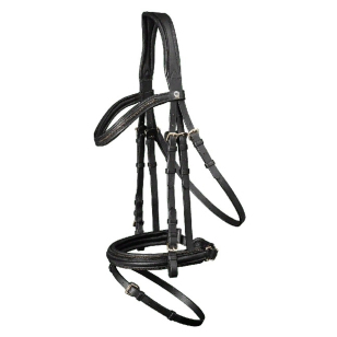 Элегантное оголовье из натуральной кожи высокого качества (Leather Bridle). Налобник и капсюль с позолоченной отделкой. У затылочного ремня анатомической формы и капсюля есть мягкая подложка, что обеспечивает комфорт вашей лошади. Латунная фурнитура. Повод в комплекте.
