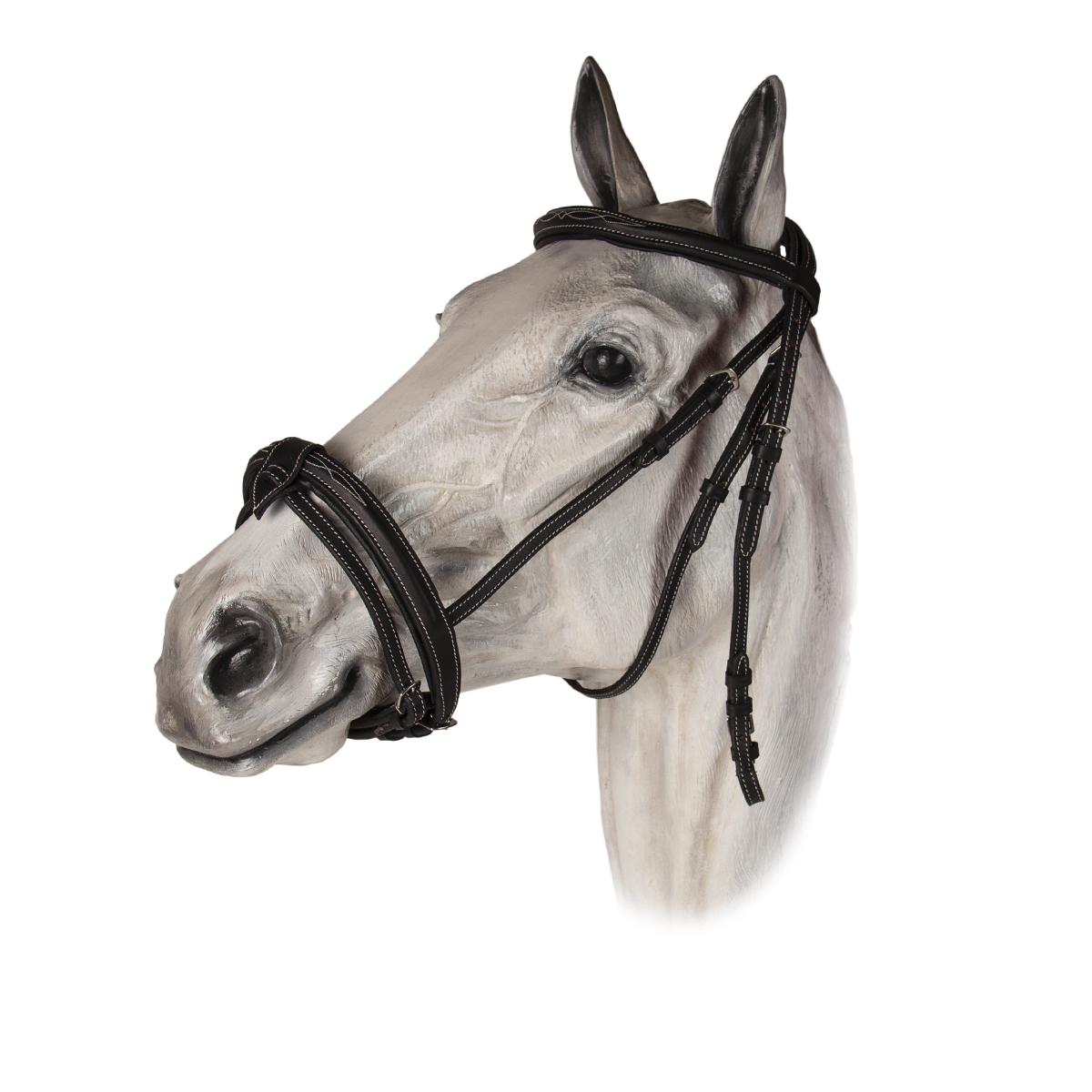 Изящное оголовье из натуральной кожи (Leather Bridle). Капсюль, налобник и затылочный ремени на мягкой подложке, что обеспечит максимальный комфорт вашей лошади. Огольвье черного цвета, украшено белой декоративной строчкой. Фурнитура серебристого цвета.