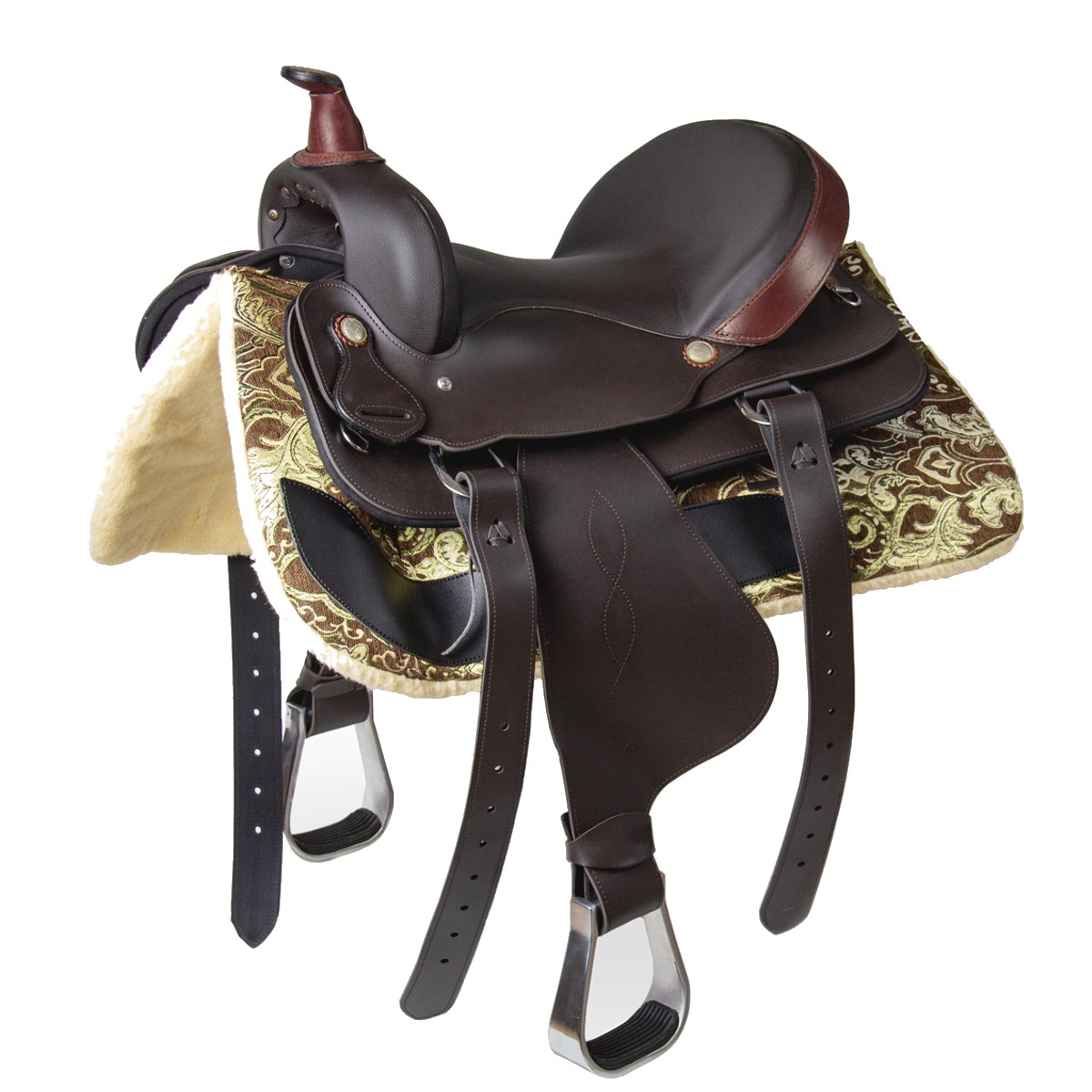 Седло украшено металлическими розетками. Металлическая фурнитура и светло-коричневые вставки делают седло очень нарядным, что позволяет использовать седло не только для тренировок, прогулок и походов, но и для праздников и шоу!
