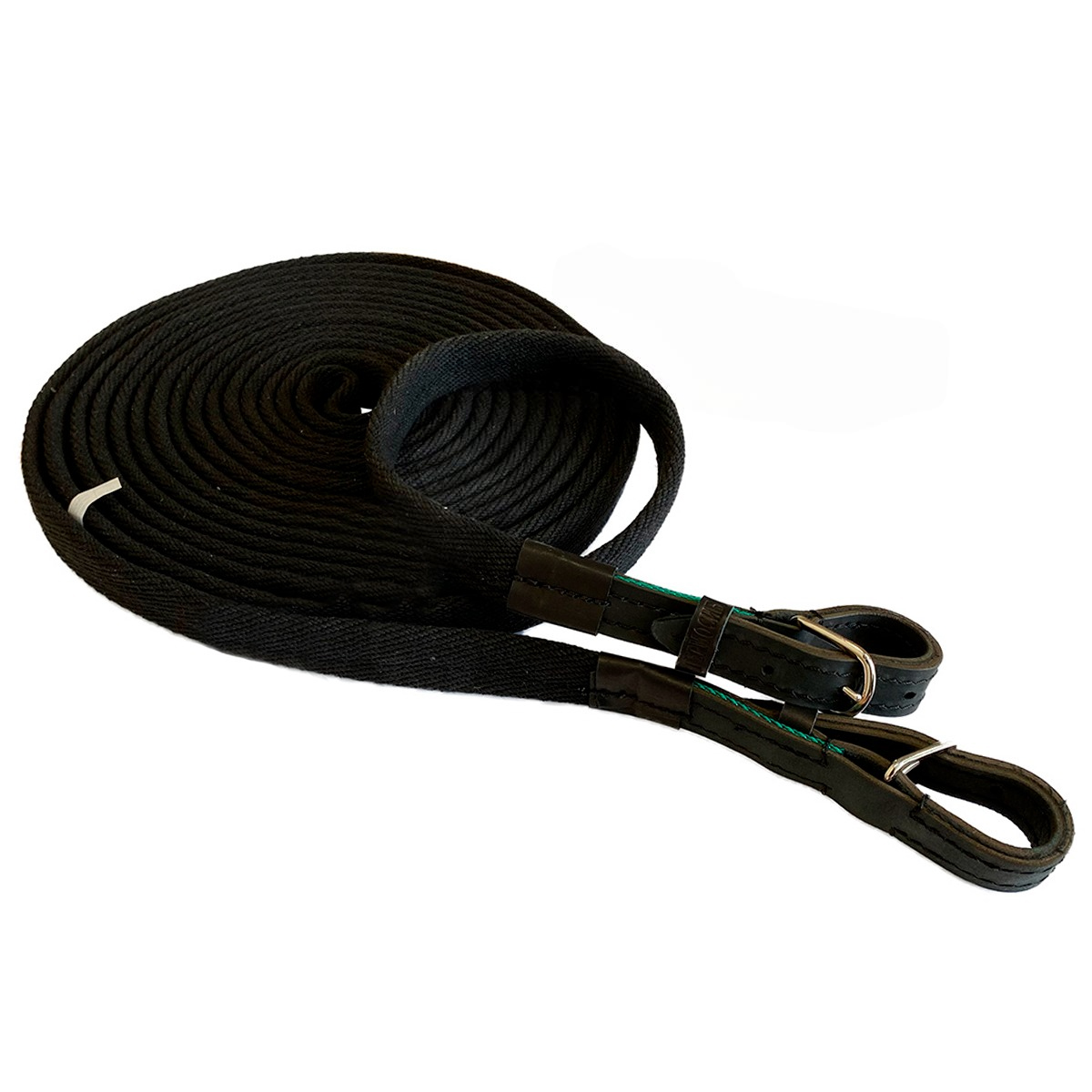 Вожжи (длиные поводья) изготовлены из ленты ЛРТ-25, обшиты белой подпружной лентой. Вожжи предназначены для управления лошадью из повозки. Крепятся к удилам с помощью кожаного ремня и пряжки. Цвет - черный. Длина - 10 м. Ширина - 2,5 см