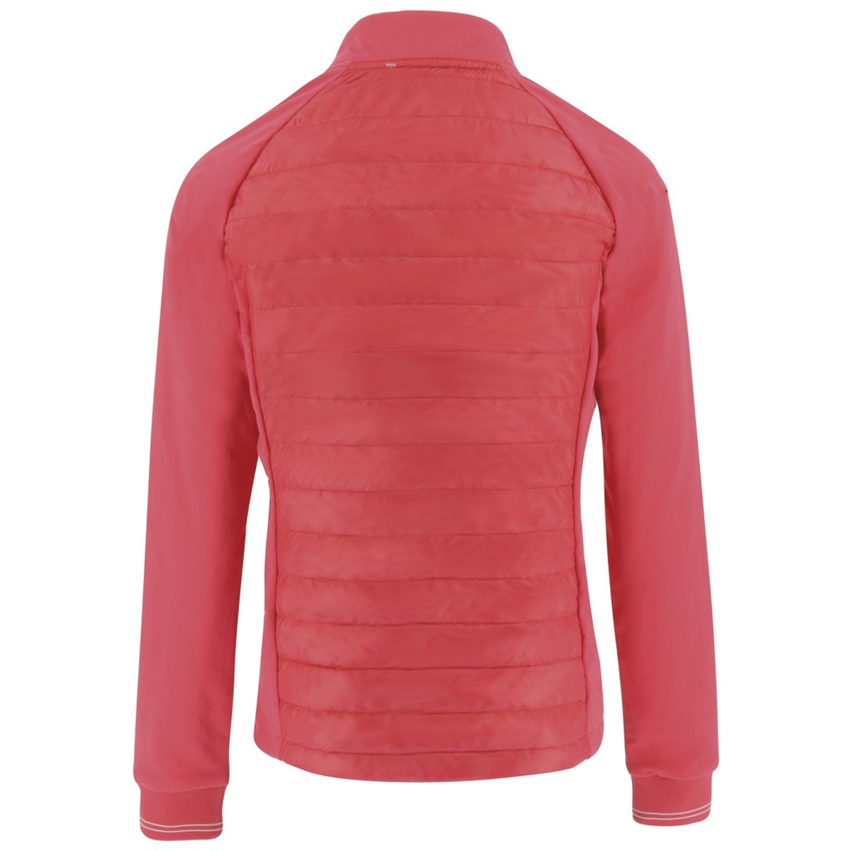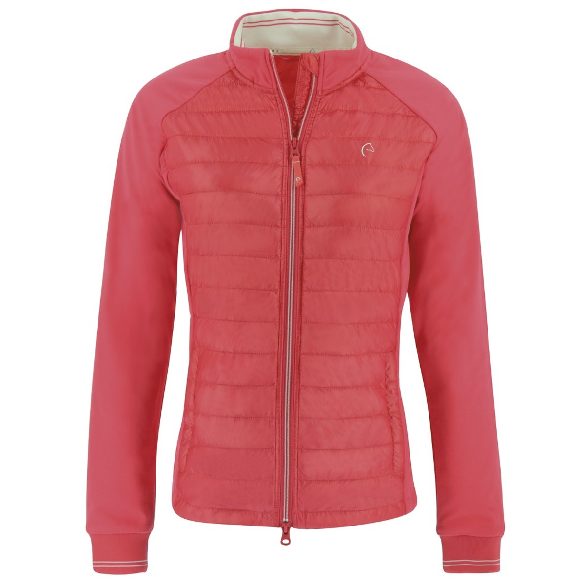 Стильная куртка (jacket) приталенного кроя для верховой езды. Выполнена из плотного, стеганого полиэстра, который защищает от ветра и осадков. Хорошо сохраняет тепло и отводит лишнюю влагу. Рукава и боковые части выполнены из плотного трикотажа на флисе, что придает мягкость и тепло. Воротник-стойка защищает шею в прохладную погоду, на рукавах манжеты из резинки. Куртка застегивается на молнию с двумя бегунками. 2 наружных кармана на молнии.