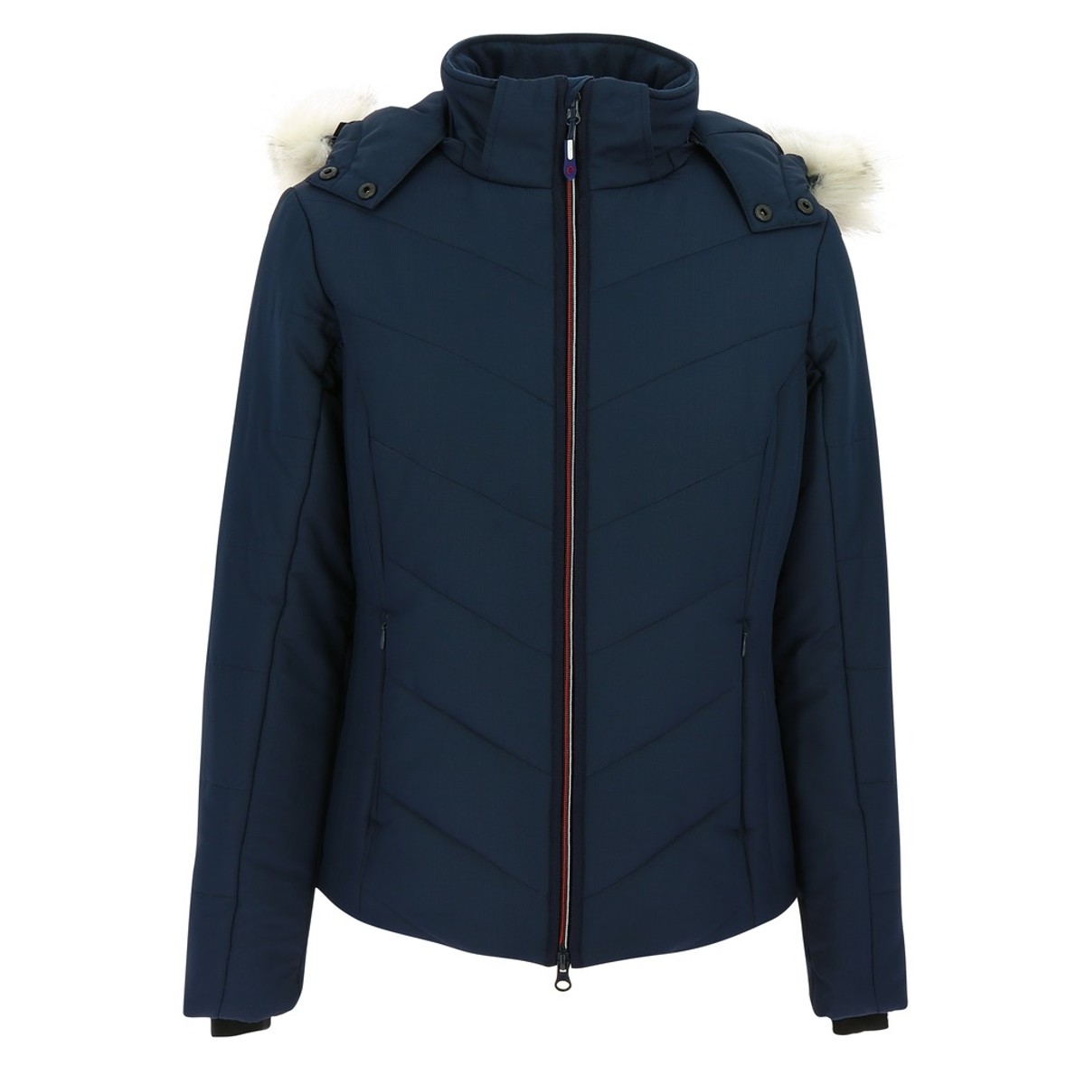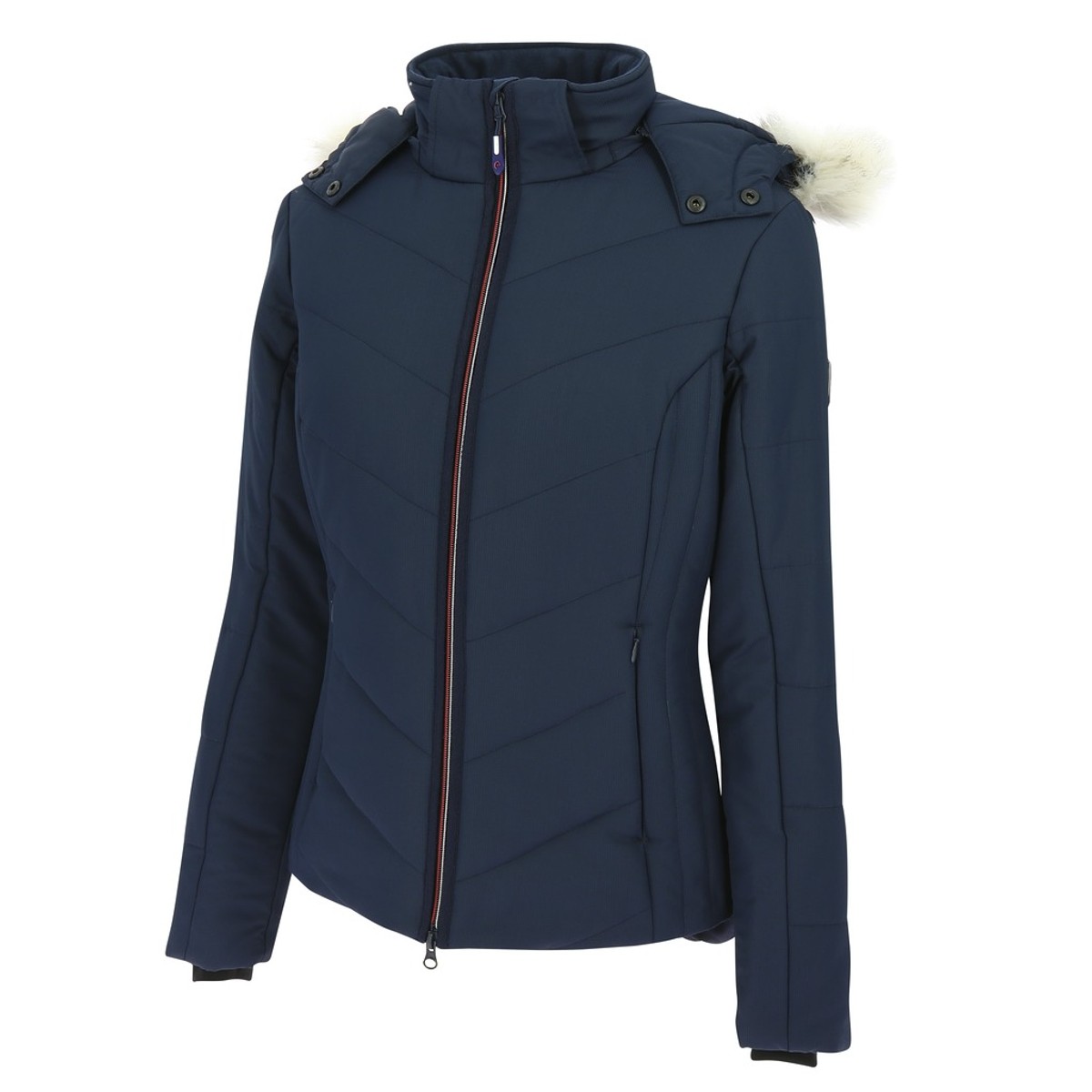 Теплая стильная куртка (jacket) для верховой езды с отделкой мехом на капюшоне. Выполнена из плотного, стеганного, не продуваемого полиэстера с наполнителем. Манжеты выполнены из трикотажа и находятся внутри рукава, что позволяет сохранять запястья в тепле и исключить попадания ветра. На внутренне стороне спины вставка из флиса. Куртка застегивается на молнию с двумя бегунками. 2 наружных кармана и один внутренний на молнии. Воротник стойка и съемный капюшон, украшенный мехом (мех отстугивается).