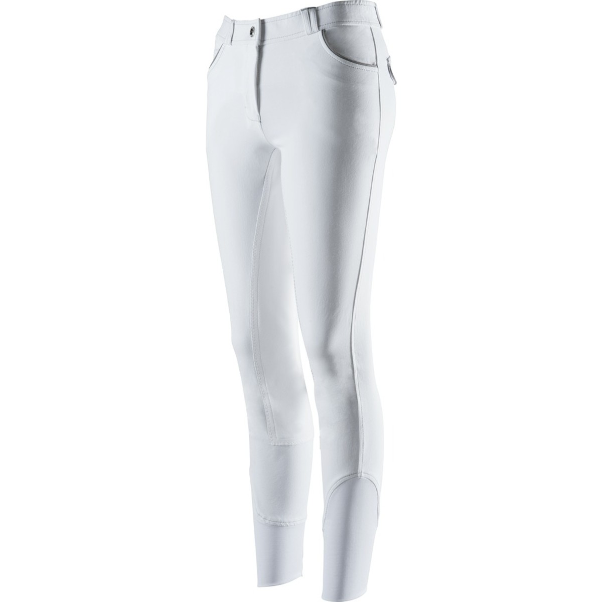 Бриджи классического покроя с полной леей (Cotton breeches with full seat) из высококачественного трикотажа. На поясе петли для ремня. Застёгиваются на молнию и брючный крючок. Два передних набедренных кармана. Сзади имитация карманов. Окантовка карманов контрастного серого цвета. В области щиколотки имеются эластичные вставки для удобства одевания.