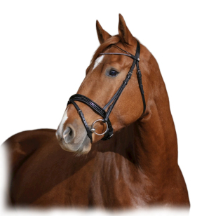 Оголовье из натуральной кожи (Leather Bridle). Широкий затылочный ремень. Двойной налобный ремень: из полиуретана с эффектом лакированной кожи и полиэстера, украшенный стразами. Нащечные ремни на крючках. Мягкая подложка на капсюле и затылочном ремне делает уздечку комфортной даже для чувствительных лошадей. Трензель и повод в комплект не входят.