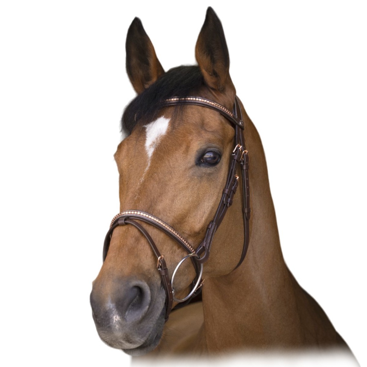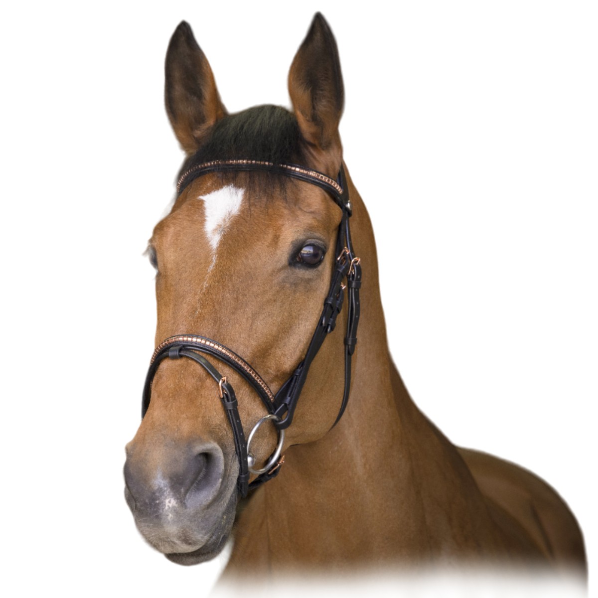 Оголовье из натуральной кожи (Leather Bridle). Широкий затылочный ремень. Налобный ремень и капсюль украшены декоративными элементами цвета "розовое золото". Пряжки имееют такой же цвет. Нащечные ремни на крючках. Мягкая подложка на капсюле и затылочном ремне делает уздечку комфортной даже для чувствительных лошадей. Трензель и повод в комплект не входят.