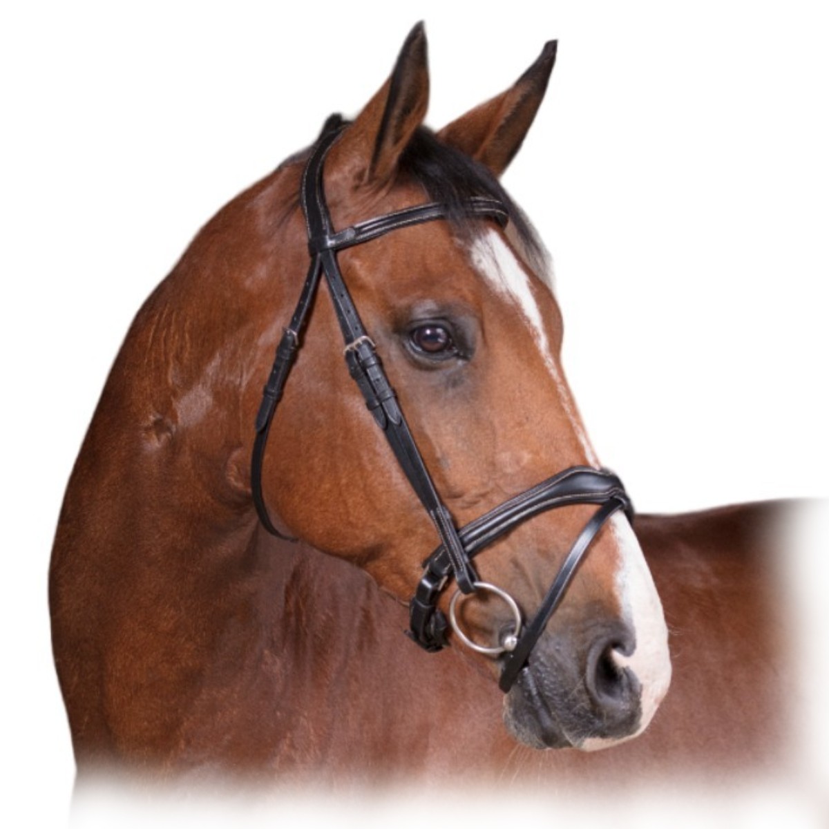 Оголовье из натуральной кожи (Leather Bridle). Затылочный ремень анатомической формы. Самозятягивающийся капсюль. Налобник украшен декоративной отстрочкой. Подкладка затылочного ремня и капсюля из мягкой кожи. Нащечные ремни на крючках. Фурнитура серебряного цвета. Трензель и повод в комплект не входят.
