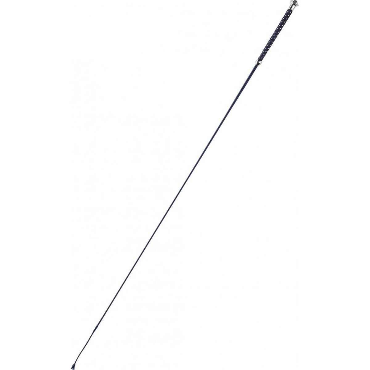 Выездковый хлыст с нескользящей плетеной ручкой из полиэстера и нитей серебристого цвета. Наконечник из металлопластика серебристого цвета. Оплетка - тесьмяный шнур.