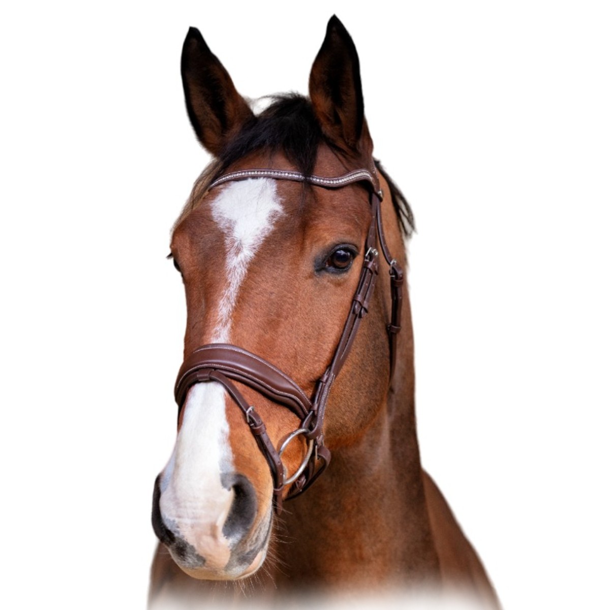 Оголовье из натуральной кожи (Leather Bridle). Затылочный ремень анатомической формы. Налобник украшен крупными стразами. Декоративная отстрочка. Самозатягивающийся капсюль. Подкладка затылочного ремня и капсюля из мягкой кожи. Нащечные ремни на крючках. Фурнитура серебряного цвета. Трензель и повод в комплект не входят.