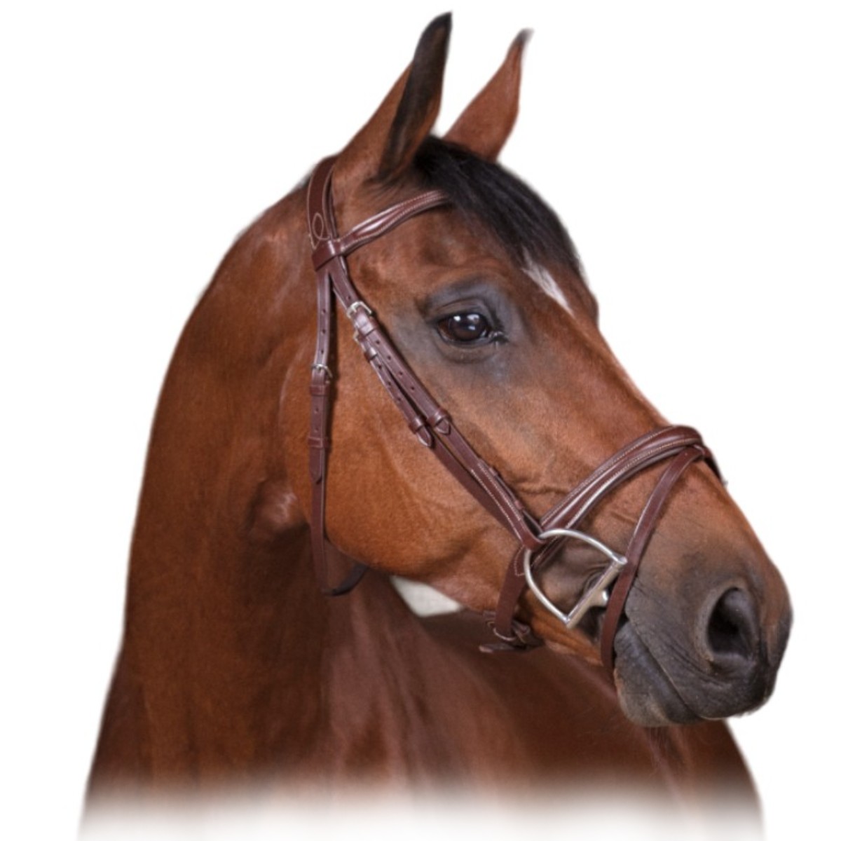 Оголовье из натуральной кожи (Leather Bridle). Затылочный и налобный ремни анатомической формы. Простой капсюль снабжен съемным ремешком-восьмеркой. Налобник украшен декоративной строчкой. Фурнитура серебряного цвета. Трензель и повод в комплект не входят.