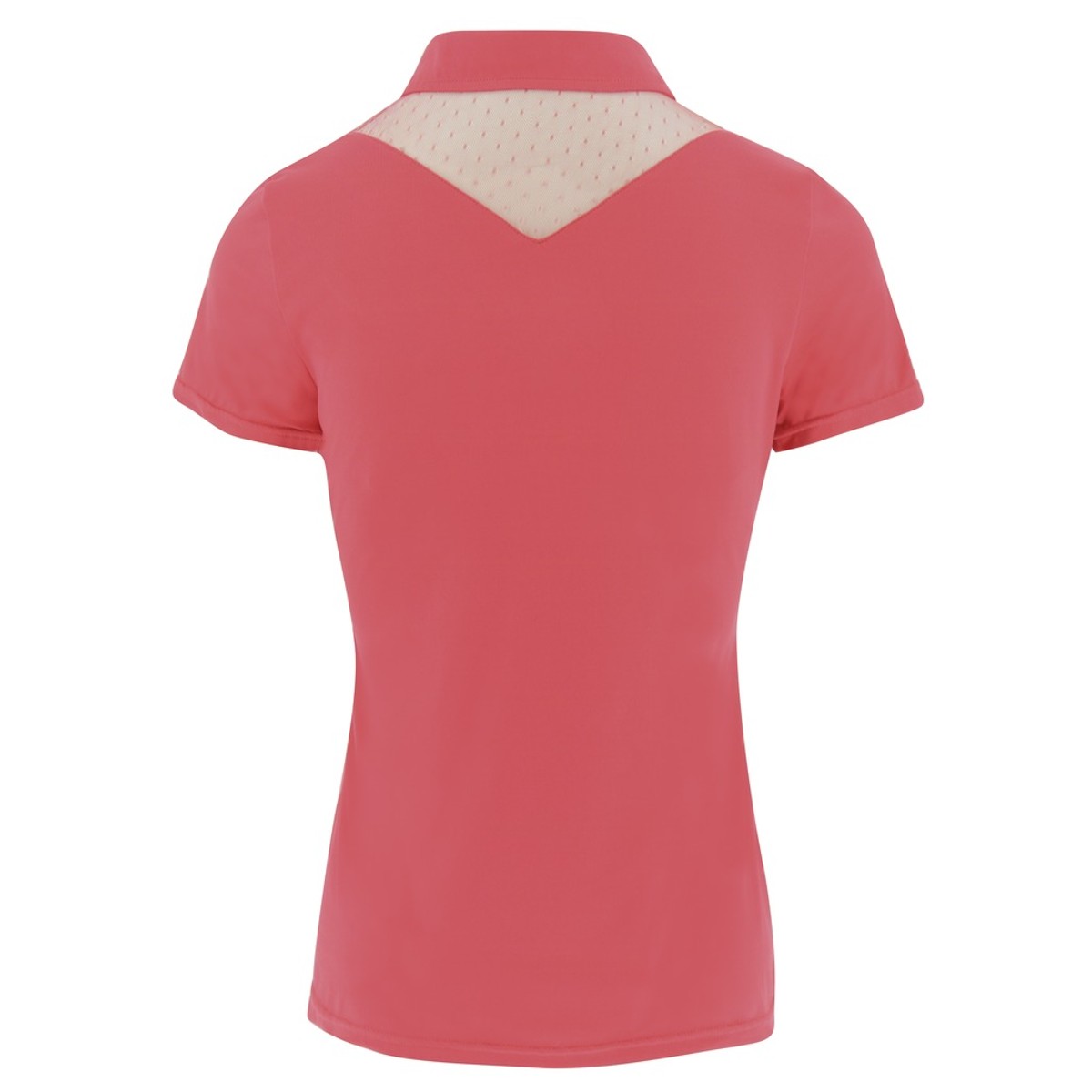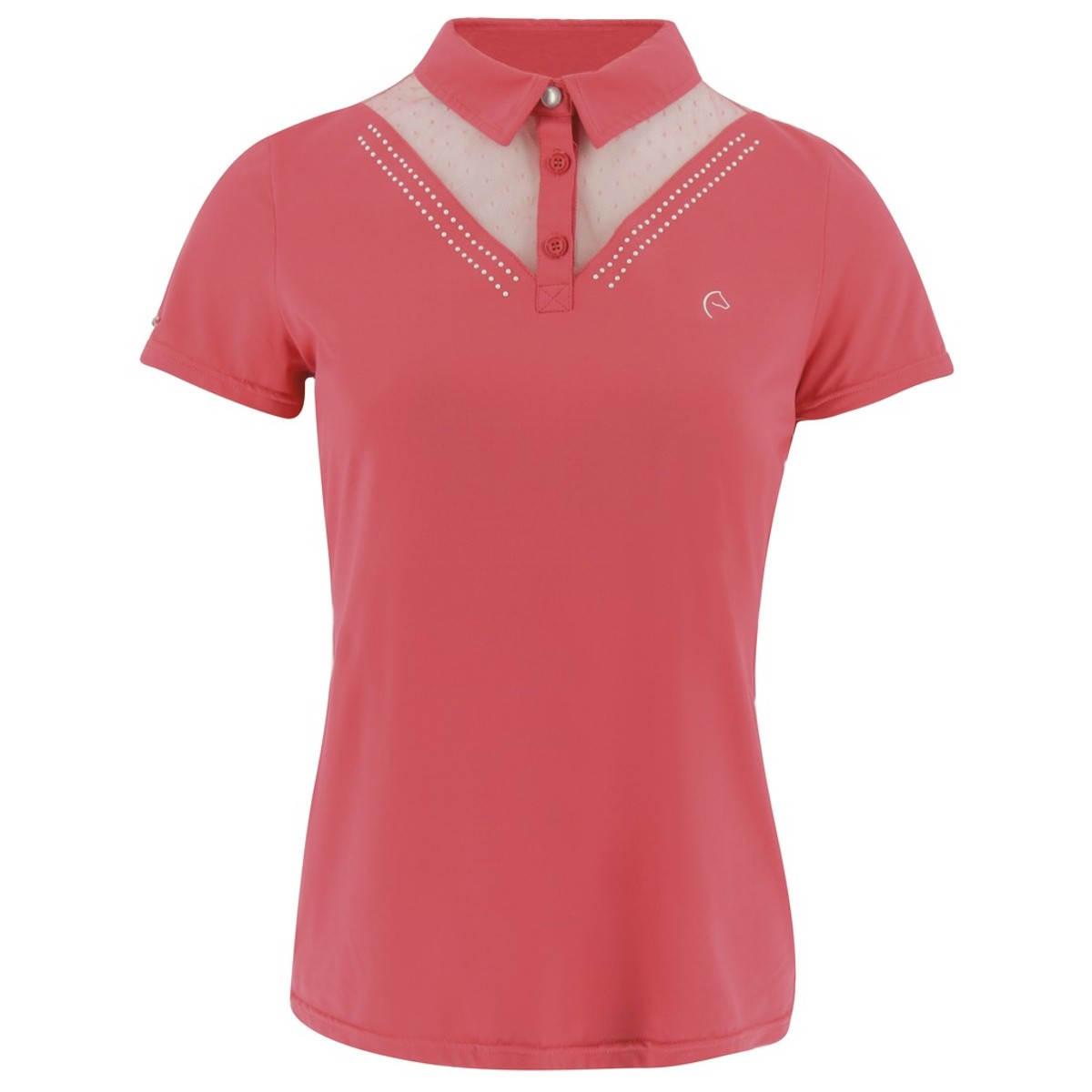 Элегантная женская рубашка-поло для выступлений с коротким рукавом (Competition blouse). Рубашка состоит из дышащего, мягкого материала, который быстро сохнет и предотвращает ощущение влажности. Сетчатая вставка спереди и сзади добавляет элегантности. Спереди полоски из жемчуга.