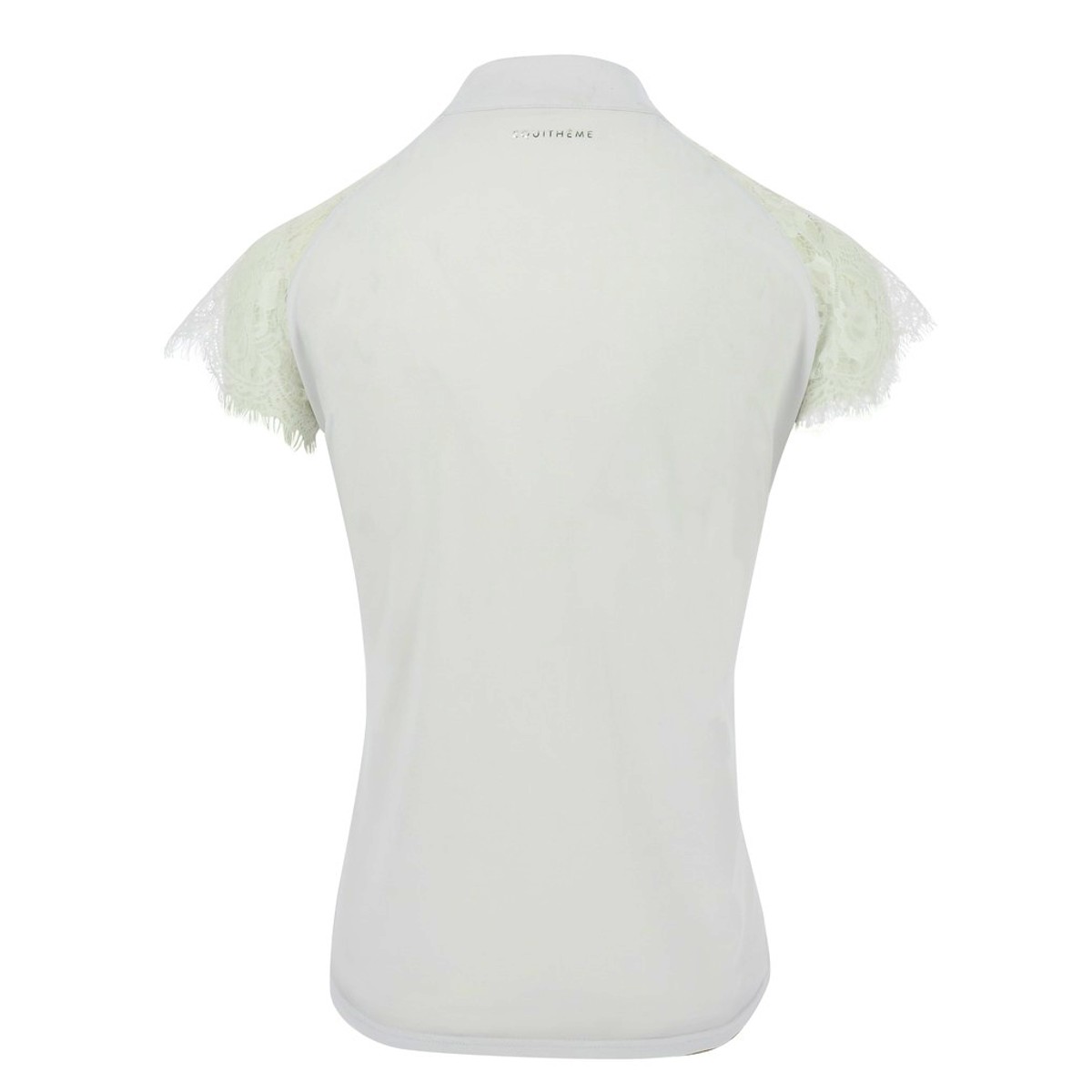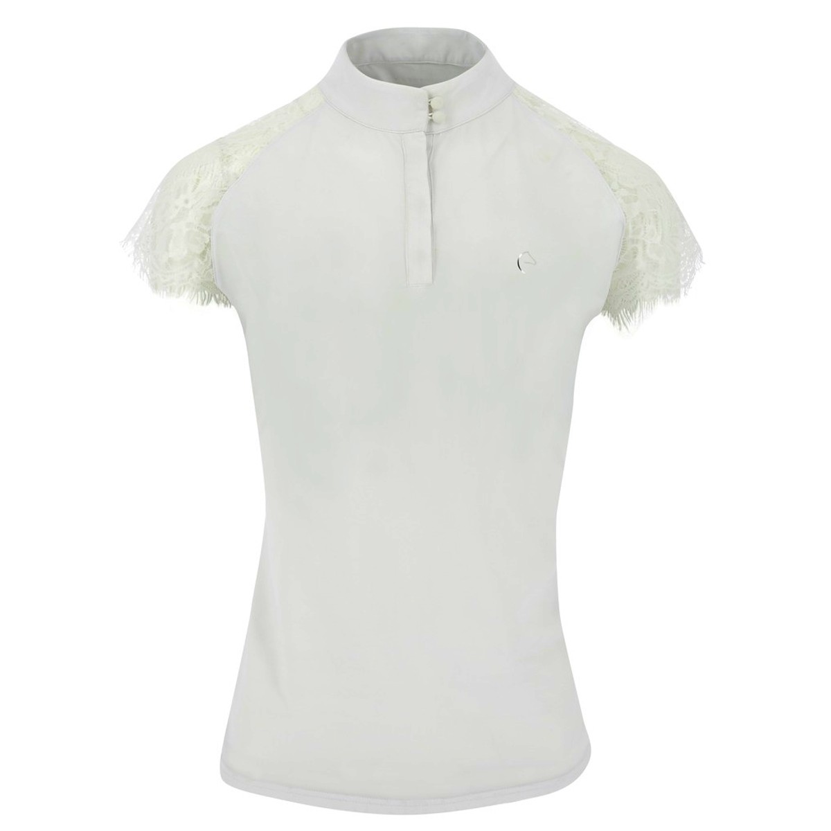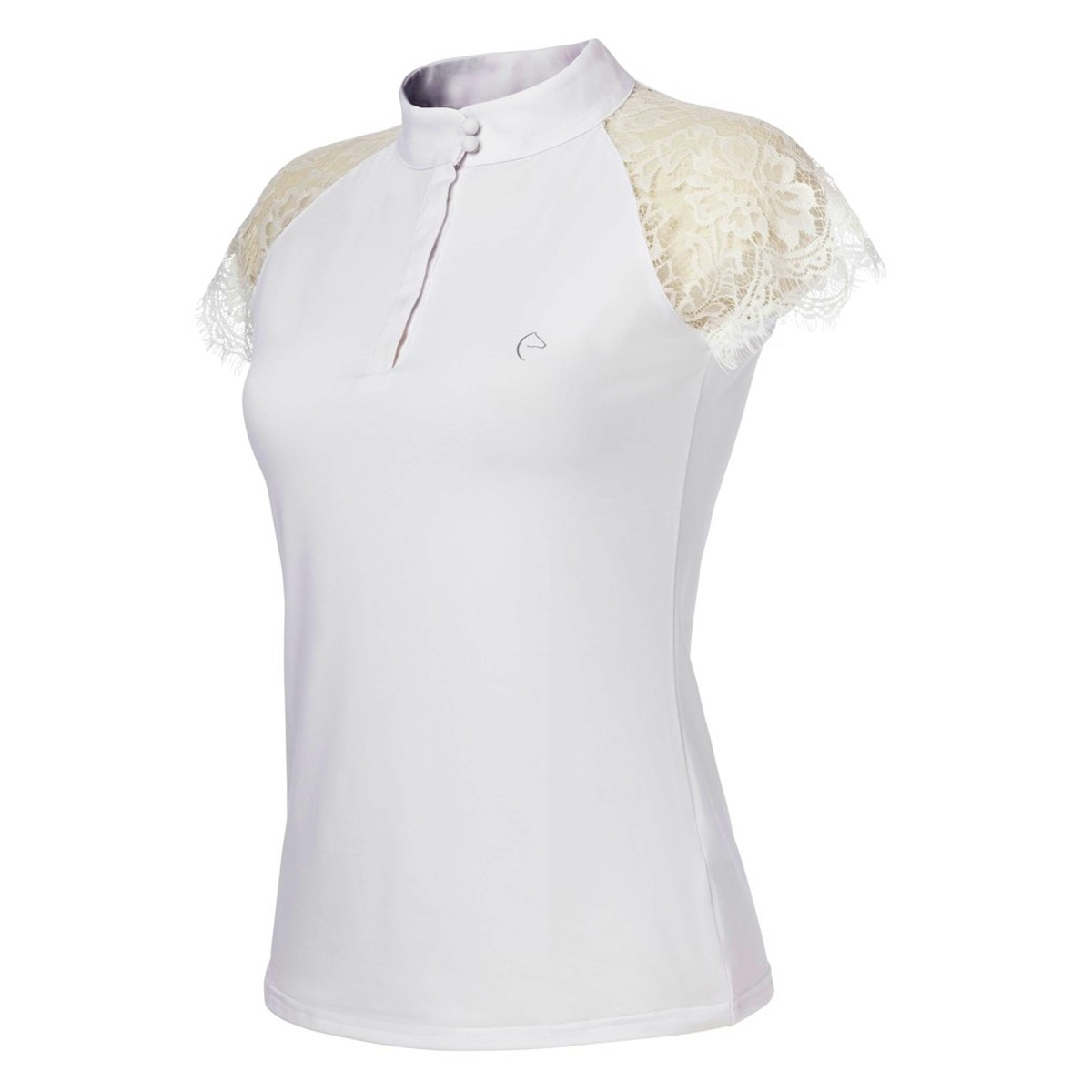 Элегантная женское кружевное поло для соревнований с короткими рукавами (Competition blouse). Рубашка состоит из дышащего, мягкого материала, который быстро сохнет и предотвращает ощущение влажности. Кружевные рукава реглан придают блузке утонченности и легкости. Спереди две декоративные пуговицы и кнопки под планкой.