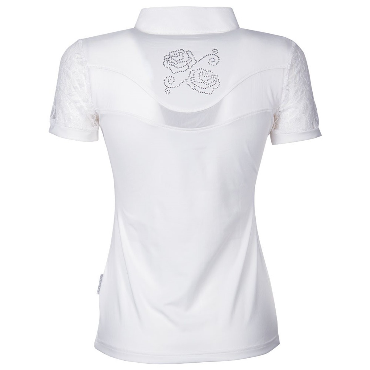 Тонкая рубашка для выступлений (Competition Shirt) с приталенным силуэтом, коротким рукавом из кружева и воротничком-стойкой. Выполнена из эластичной лёгкой дышащей ткани. Спереди застегивается на кнопки - кристаллы. На груди и спине логотип в виде розы, украшенной стразами. Кружевная вставка на спине.