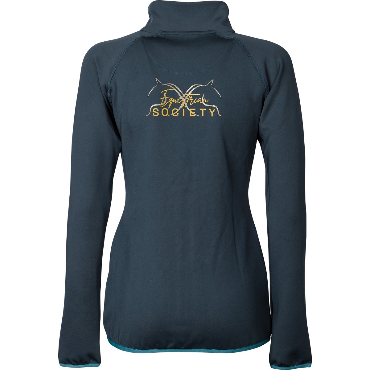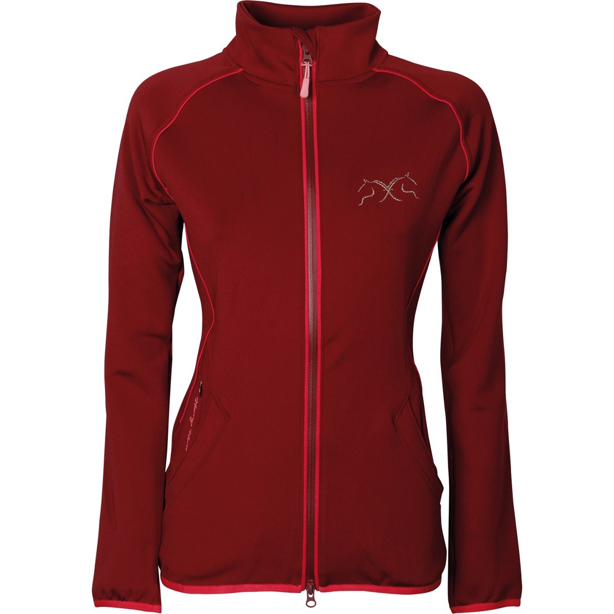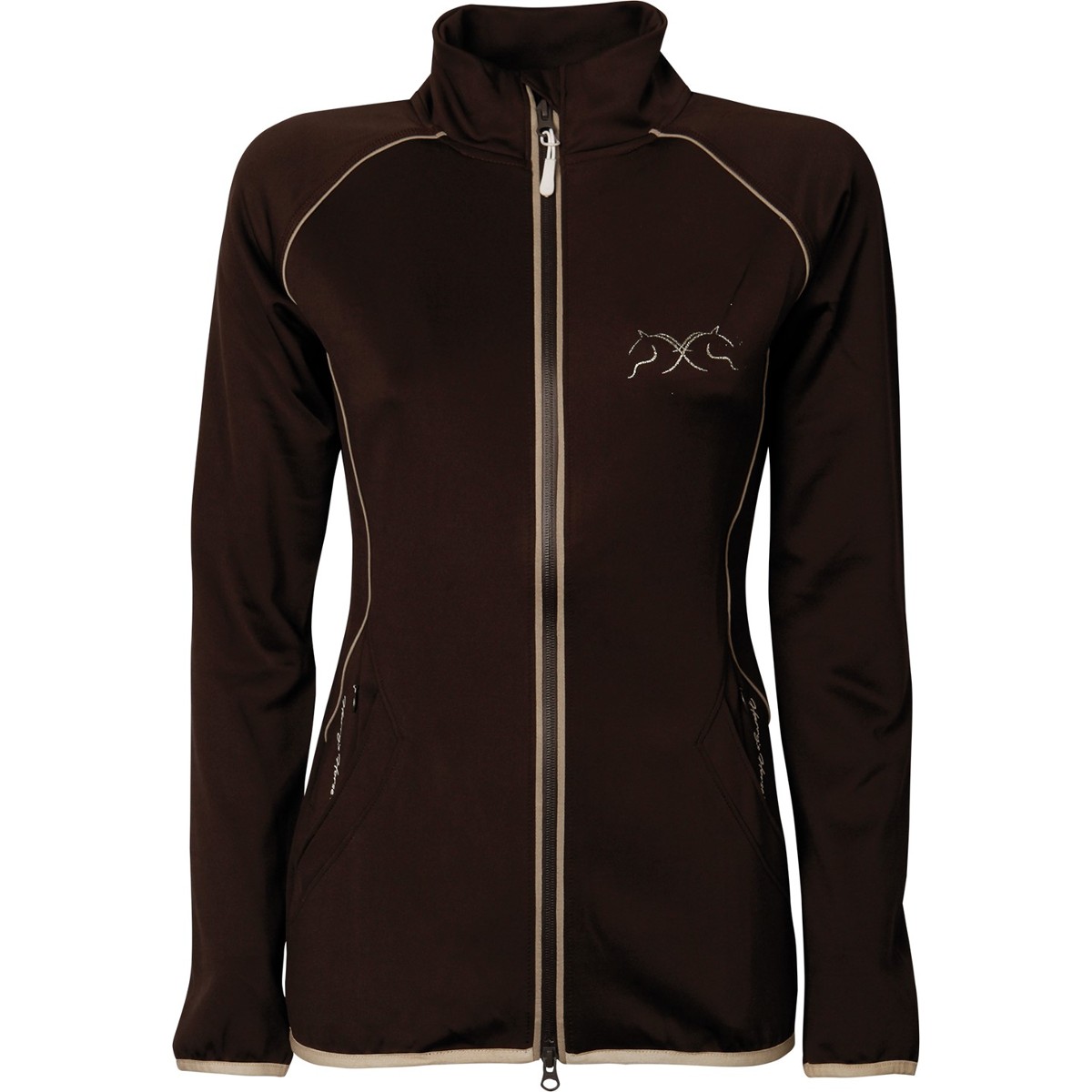 Легкая женская толстовка для верховой езды (Women's Jacket). Выполнена из эластичной синтетической ткани. Высокий воротник защищающий шею в прохладную погоду. Застегивается на молнию с двумя бегунками. Два кармана на молниях по бокам. Два дополнительных потайных кармана на молнии. Толстовка украшена контрастным голубым кантом и логотипом на груди и спине.