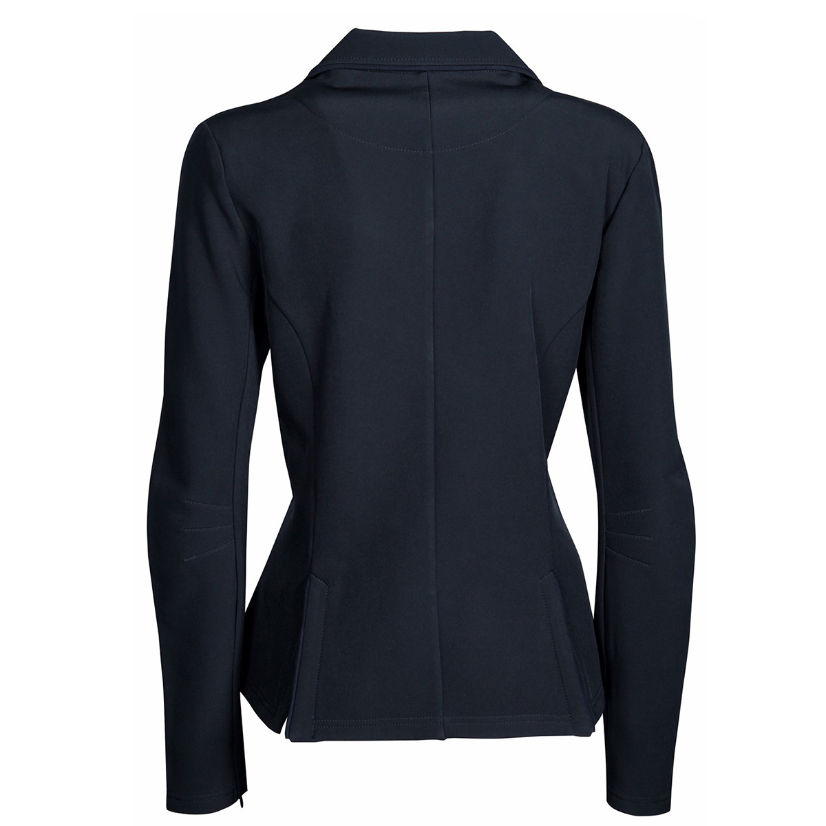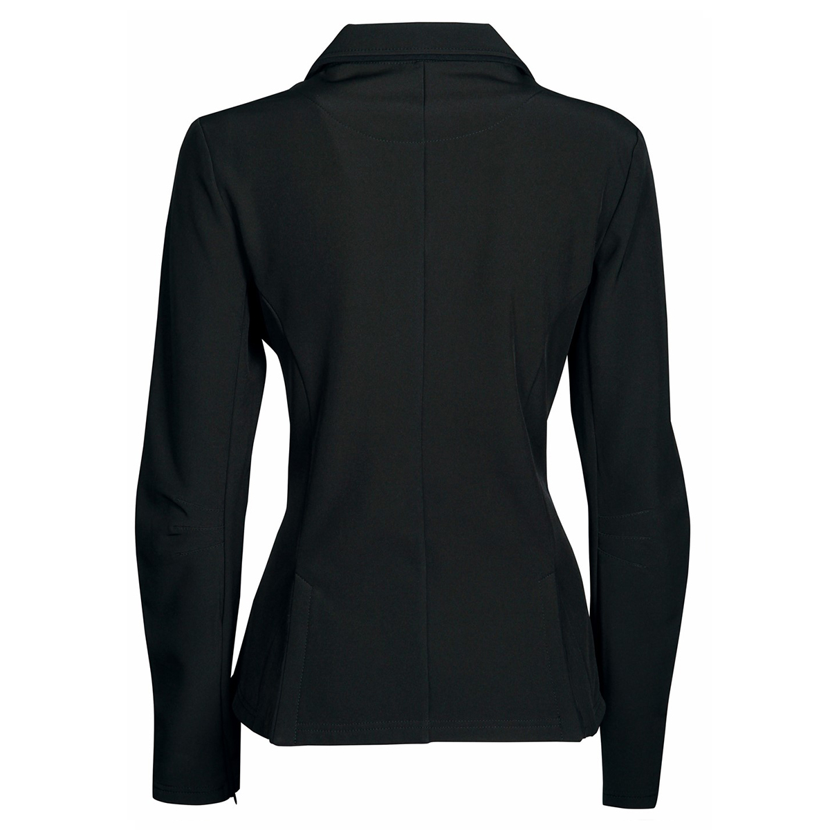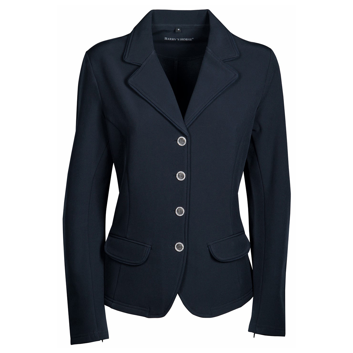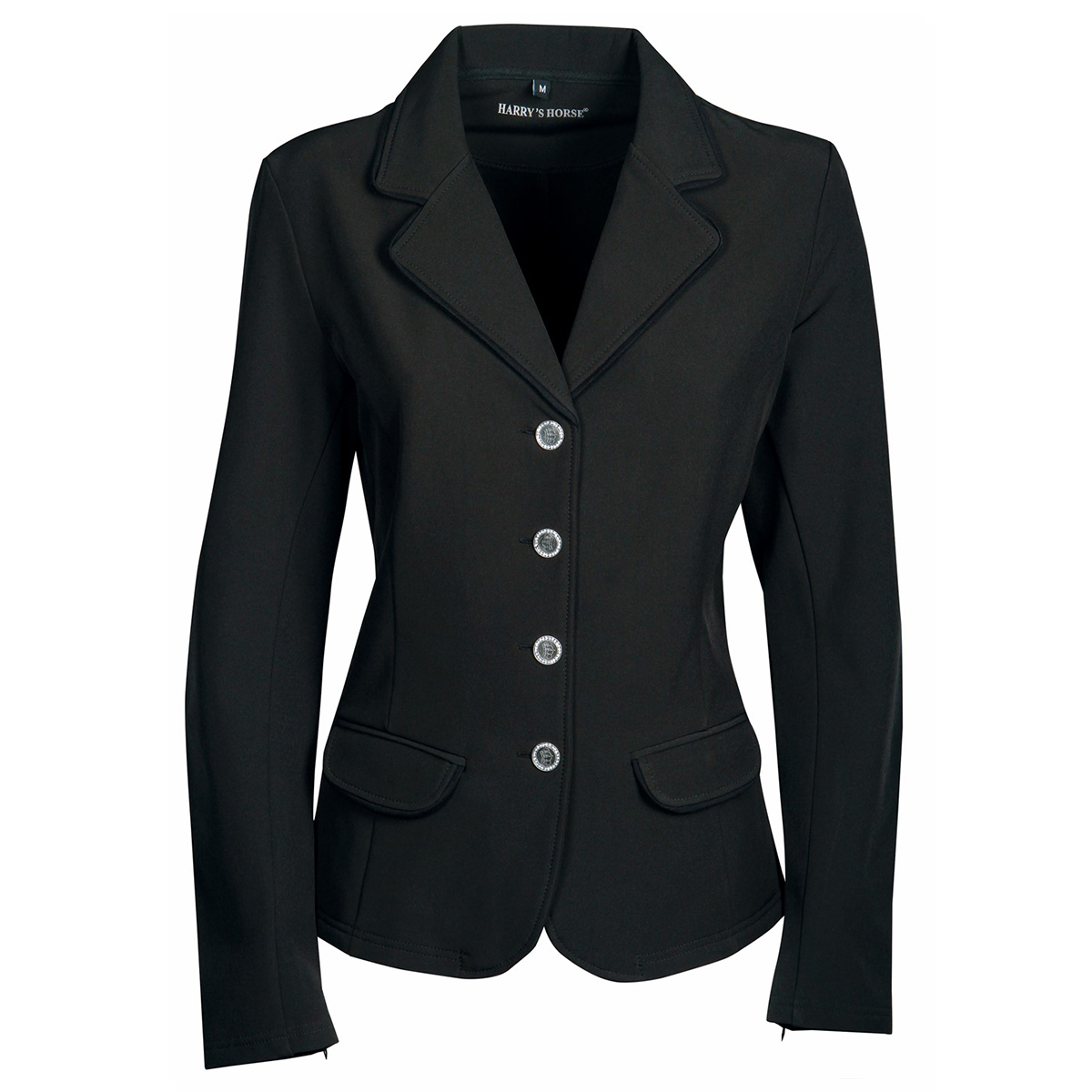 Элегантный приталенный редингот для выступлений (Competition jacket). Изготовлен из высококачественной водоотталкивающей и ветрозащитной ткани softshell. Два передних кармана на клапанах и две шлицы сзади. Черная окантовка по краю воротника и карманов. Пуговицы украшены стразами. На рукаве потайной замок для удобства одевания.