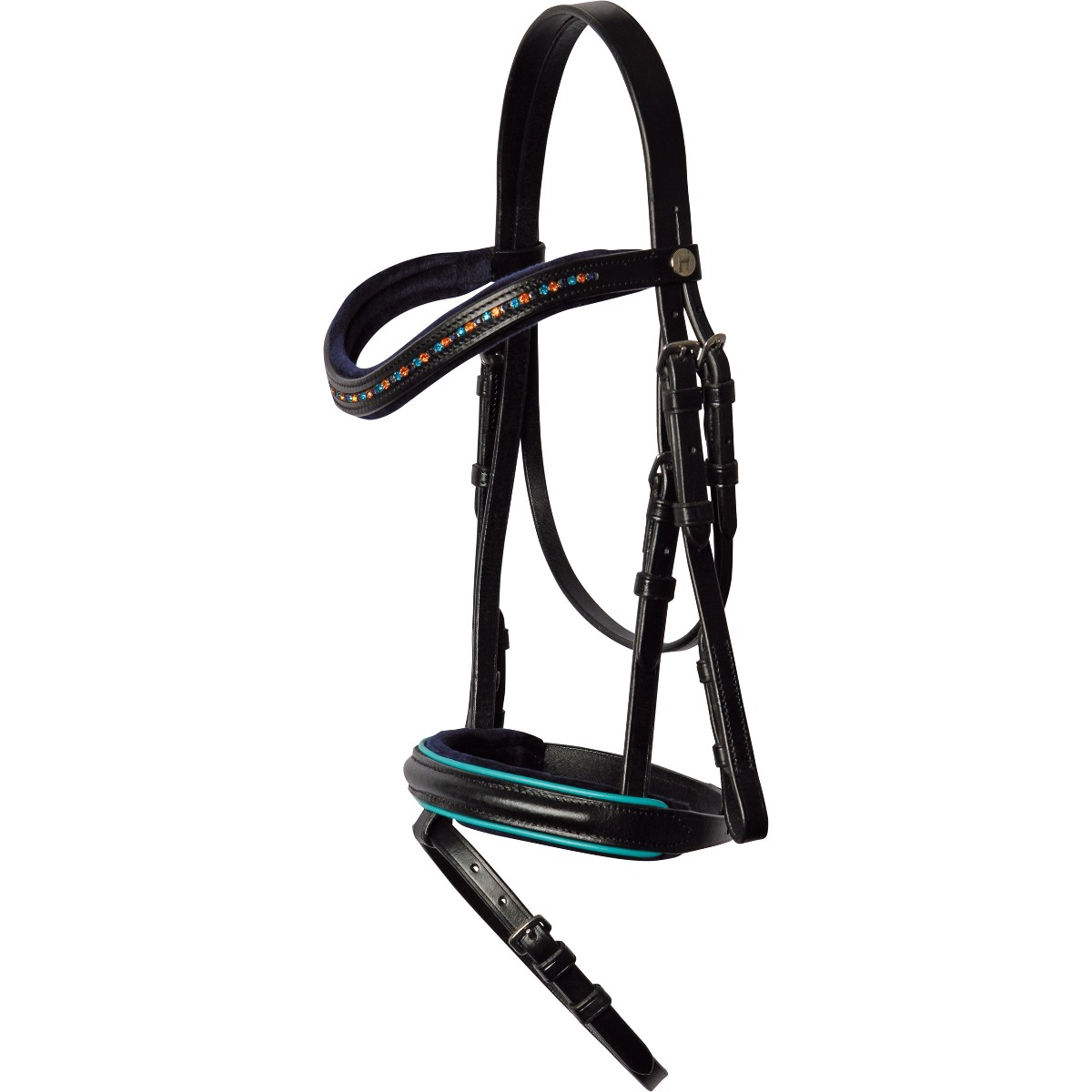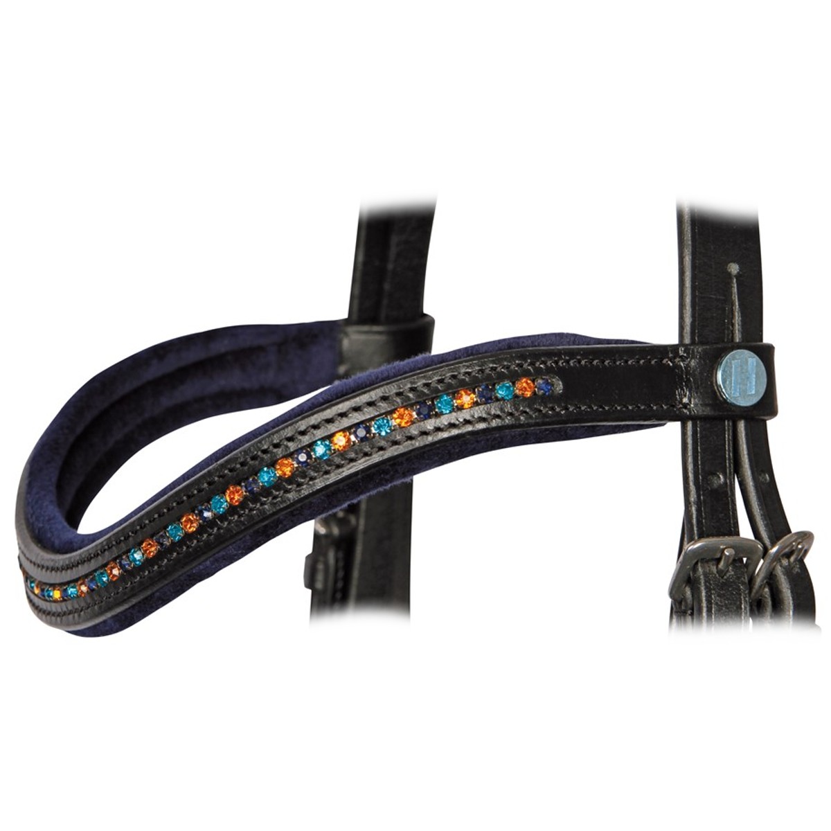 Классическое оголовье из кожи (Leather Bridle) с двойным капсюлем. Совмещает эффект высокого и низкого капсюля. Налобный ремень украшен цветными стразами. На капсюле контрастная кайма. У налобника и капсюля есть мягкая подложка, что обеспечивает комфорт вашей лошади. Фурнитура серебристого цвета. В комплект входит тесьмяный повод с ограничителями. Трензель в комплект не входит.