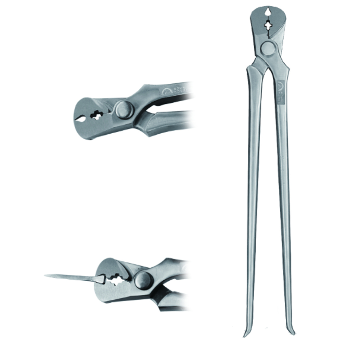 Клещи (pincers) для гвоздей разработаны для быстрого и удобного удаления гвоздей из подковы. Клещи сделаны из высококачественной инструментальной стали 4140. Конструкция зубцов клещей позволяет прочно захватывать головки всех типов гвоздей, даж тех, которые посажены очень глубоко. Закаленные зубцы обеспечивают долгий срок службы инструмента. Имеют удобную рукоять, что важно в ежедневном использовании.