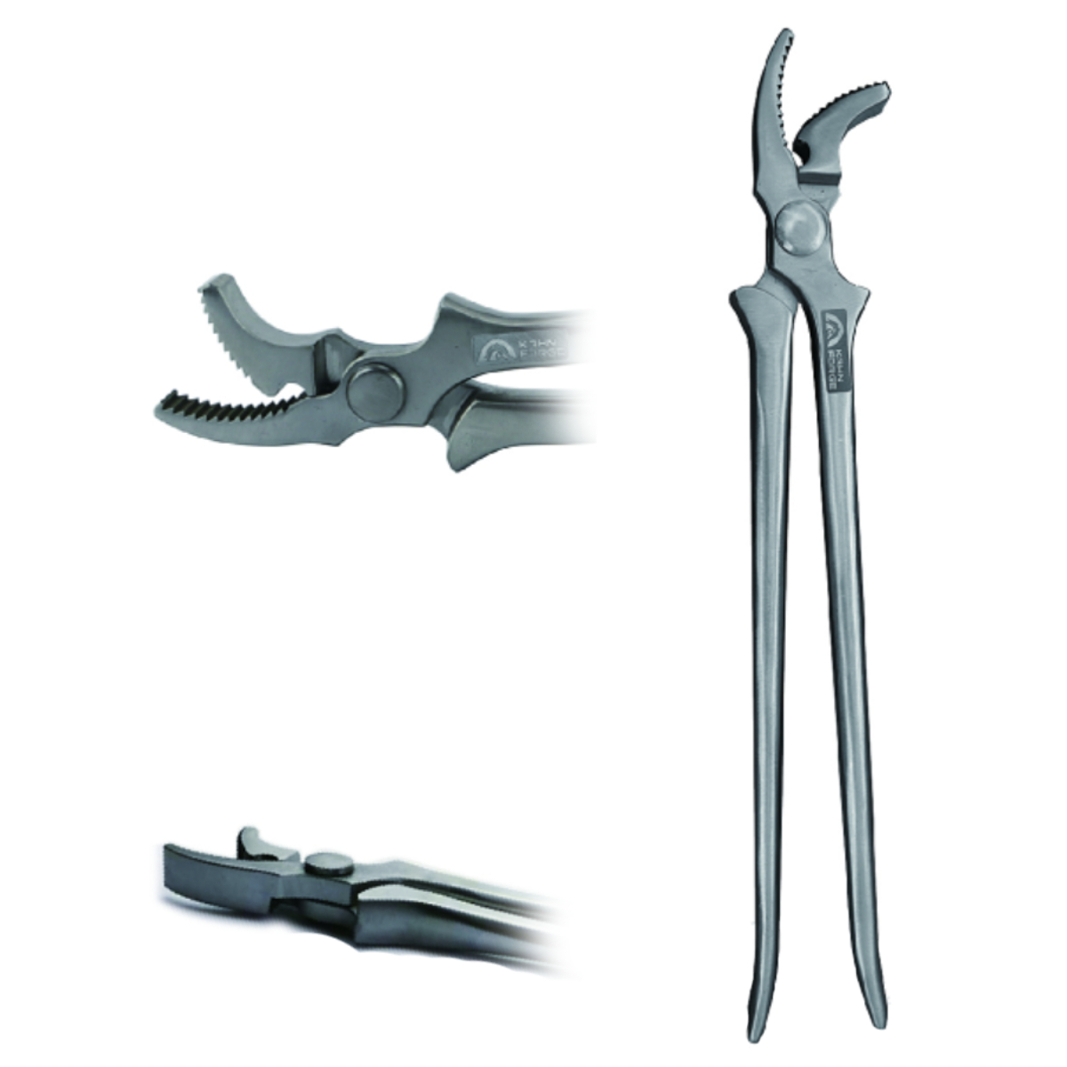 Клещи для затягивания гвоздей (Nail Clincher) из высококачественной инструментальной стали. Клинчер используется для затягивания кончика гвоздя после удаления лишней длины. Это хорошо сбалансированные клещи с удобными ручками, подходят для гвоздей разной длины. Дополнительная насечка на зубьях клинчера позволяет легко затягивать кончики гвоздей. Благодаря удлиненной изогнутой части головки, инструмент подходит для лошадей с большими копытами. Клинчер сделан из высококачественной инструментальной стали 4140, что обеспечивает длительный срок службы инструмента и его точность.
