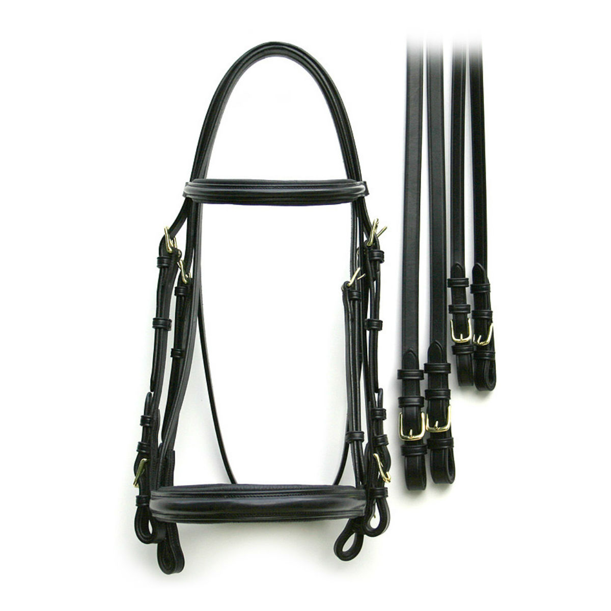 Кожаное мундштучное оголовье с самозатягивающимся капсюлем. Подкладка капсюля и налобного ремня сделана из мягкой кожи, что обеспечивает максимальный комфорт вашей лошади. Все пряжки сделаны из нержавеющей стали серебряного цвета. В комплект входят два кожаных повода. Кожа высокого качества и фурнитура из нержавеющей стали обеспечат долгую службу оголовья.