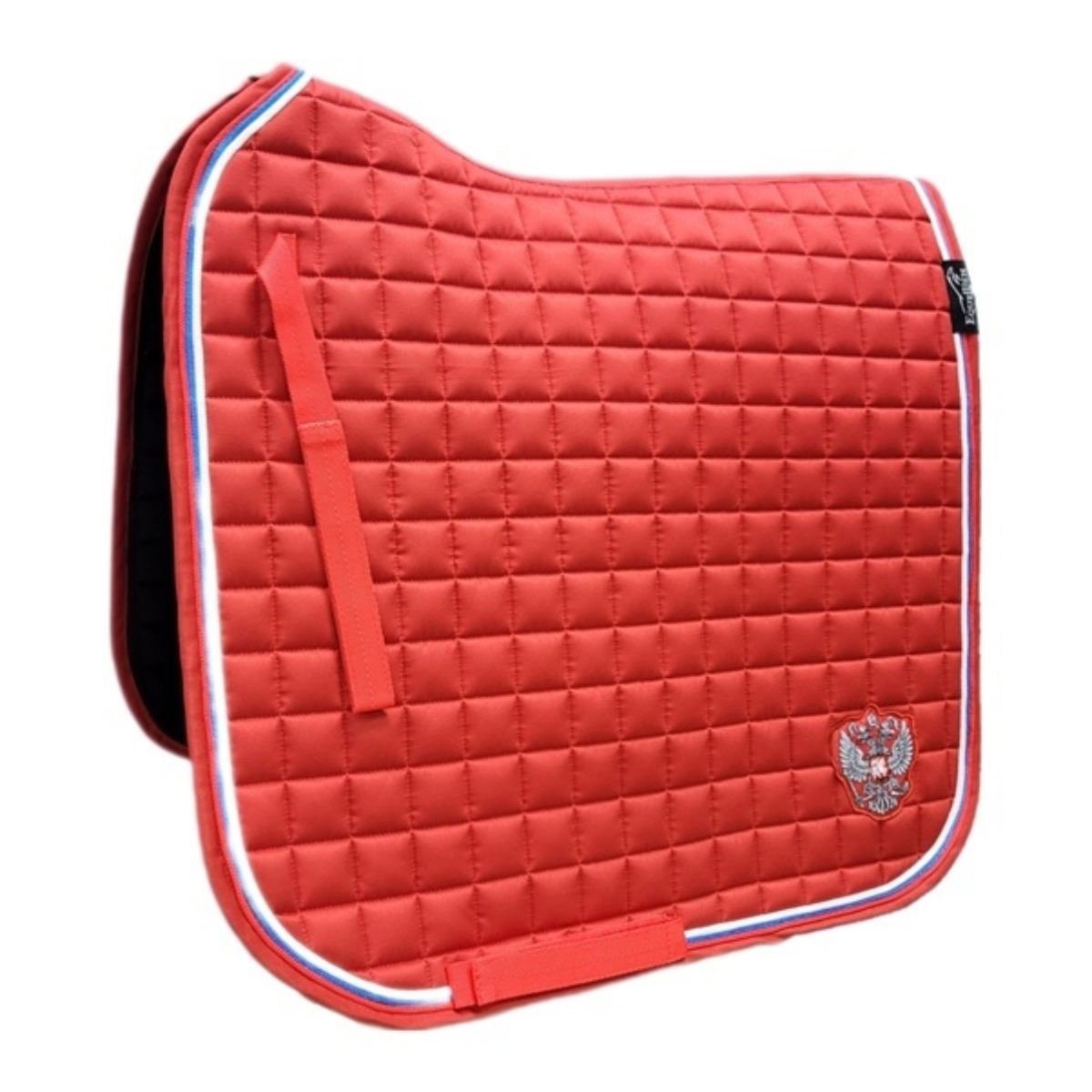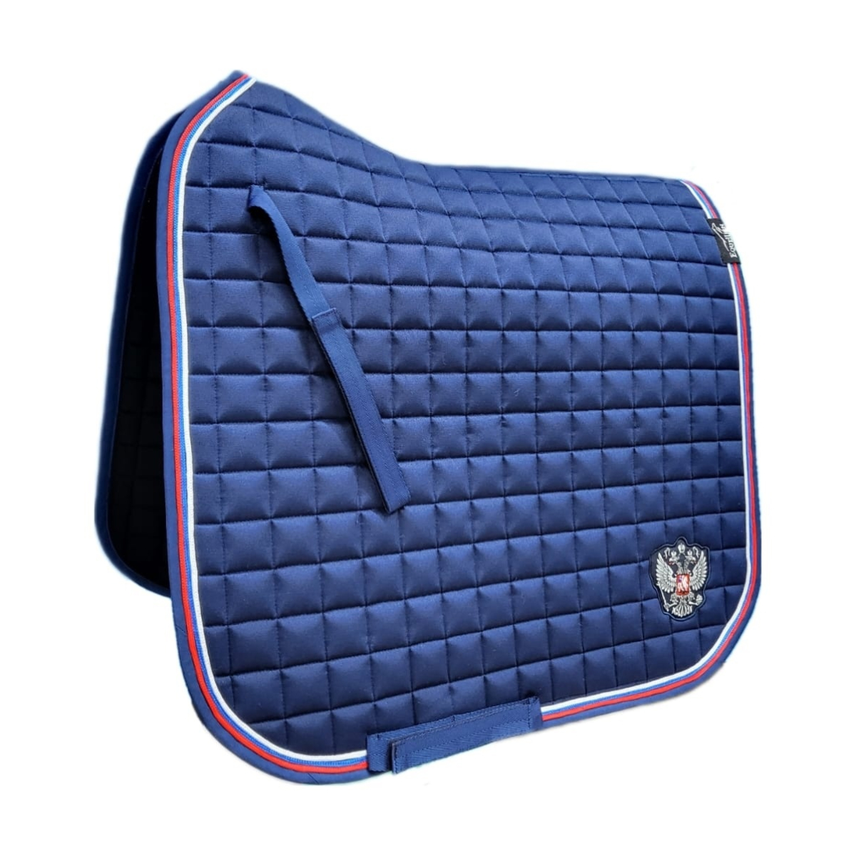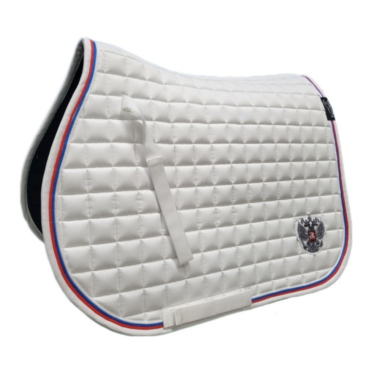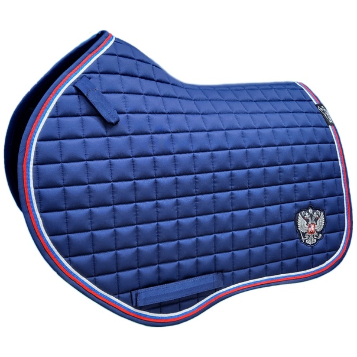 Вальтрап (Saddle Pad) анатомической формы с мягким наполнителем. Прочная, износостойкая ткань вальтрапа позволяет использовать его в ежедневной работе. Отлично держит форму после многократных стирок. Хорошо впитывает пот лошади во время работы. Очень эффектная модель. Имеет тройной кант цвета Российского флага. Украшен шевроном в виде серебристого герба. Имеется крепление к седлу на липучках для предотвращения сползания. Вальтрап оснащен креплением к подпруге седла на липучках для более комфортной и быстрой седловке лошади. Вам больше не требуется протягивать подпругу через петлю – достаточно просто расстегнуть липучку.