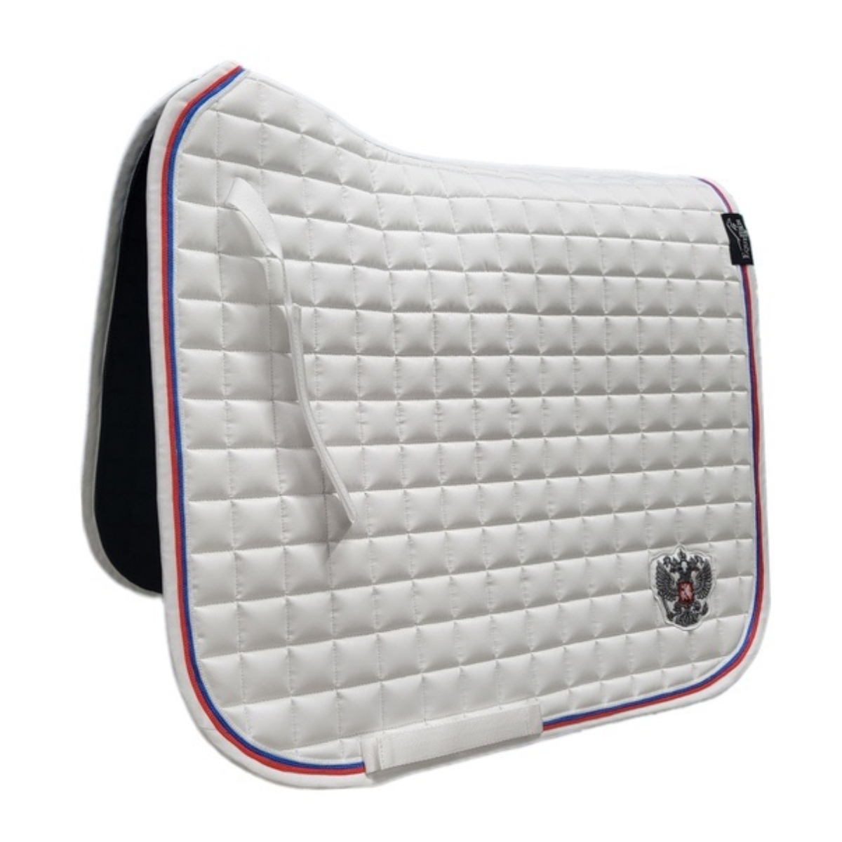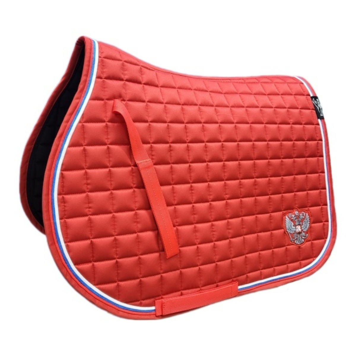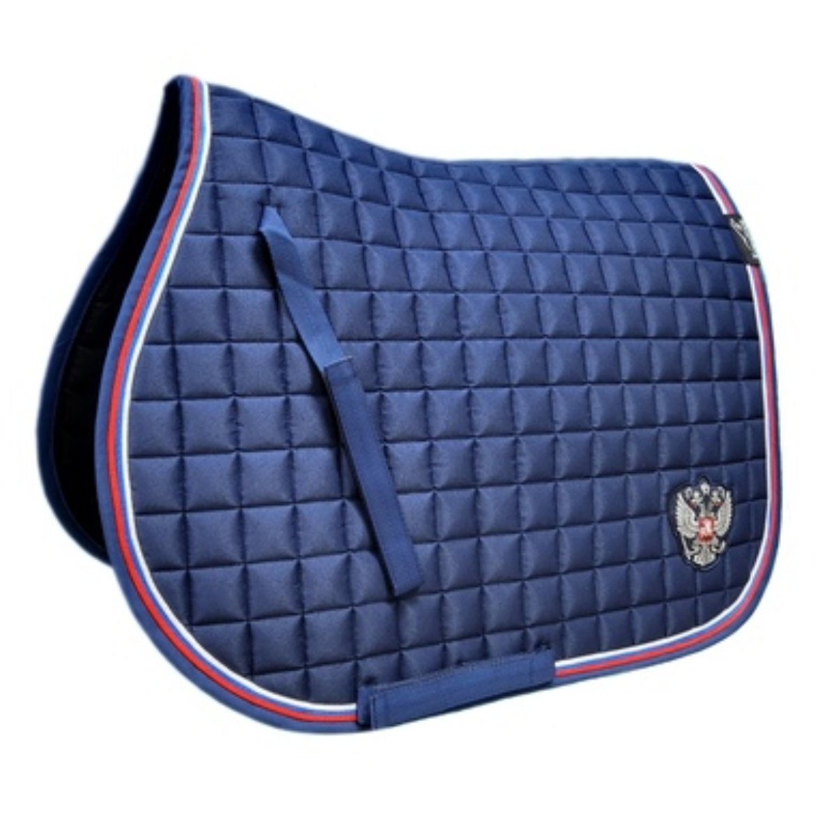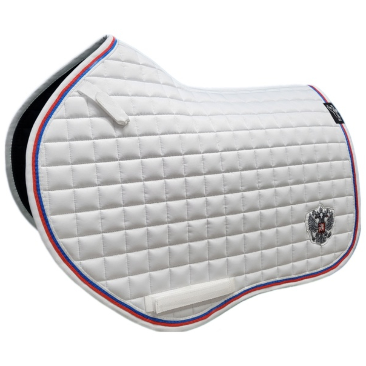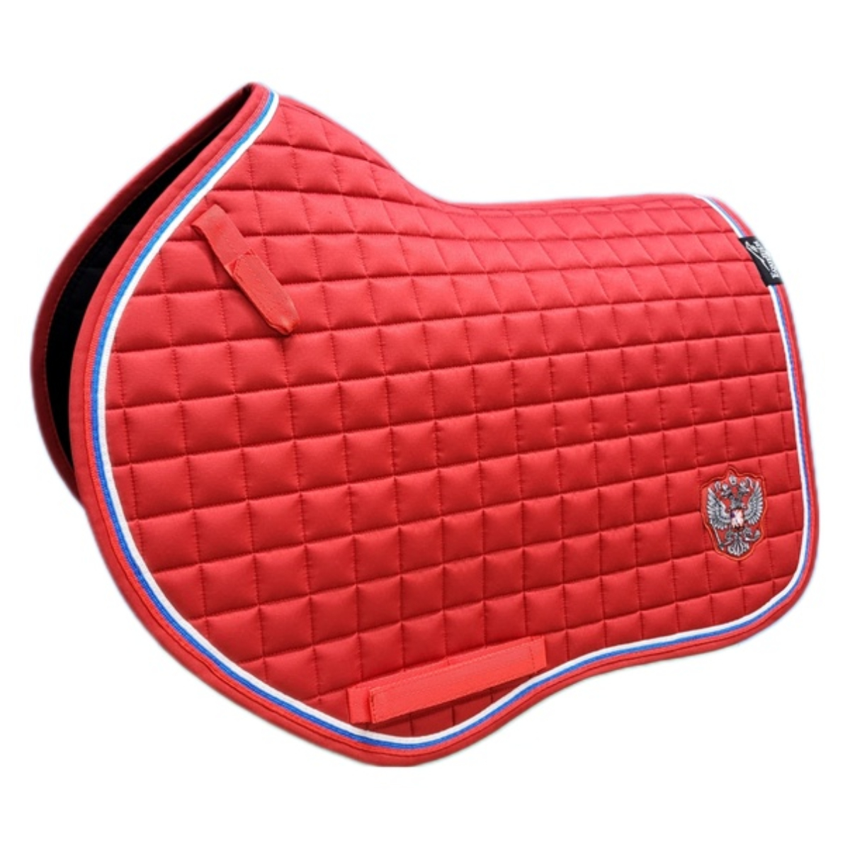 Вальтрап (Saddle Pad) анатомической формы с мягким наполнителем. Прочная, износостойкая ткань вальтрапа позволяет использовать его в ежедневной работе. Отлично держит форму после многократных стирок. Хорошо впитывает пот лошади во время работы. Очень эффектная модель. Имеет тройной кант цвета Российского флага. Украшен шевроном в виде серебристого герба. Имеется крепление к седлу на липучках для предотвращения сползания. Вальтрап оснащен креплением к подпруге седла на липучках для более комфортной и быстрой седловке лошади. Вам больше не требуется протягивать подпругу через петлю – достаточно просто расстегнуть липучку.