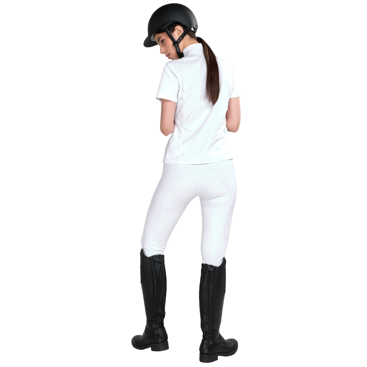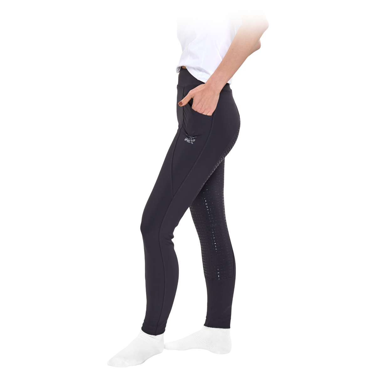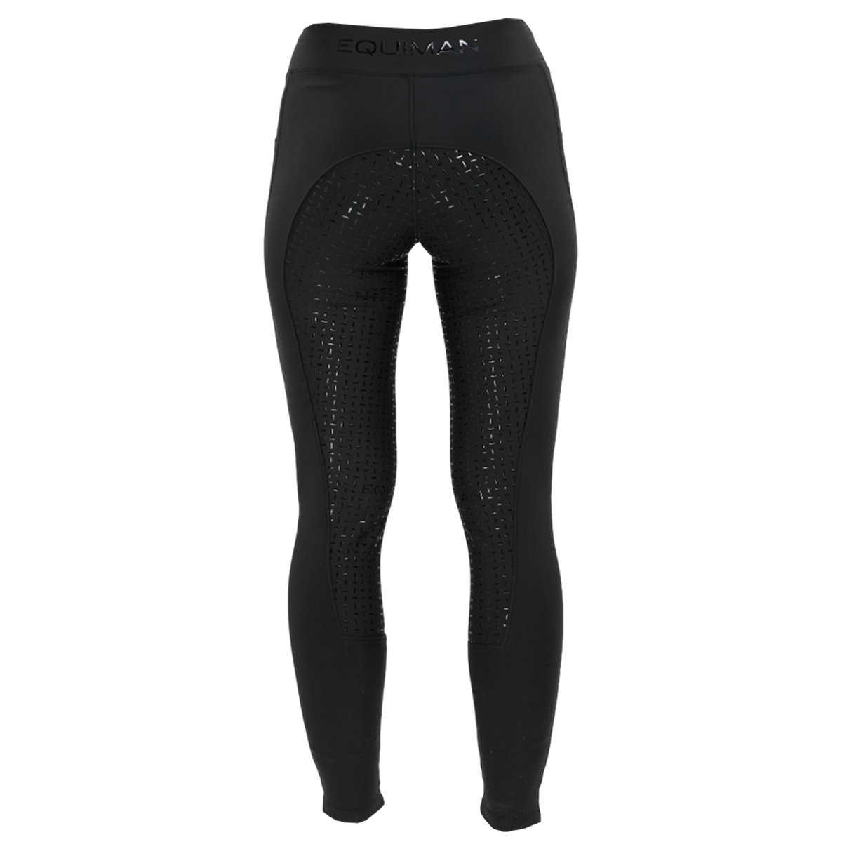 Леггинсы с высокой талией и силиконовой полной леей (Breeches with Silicone Patch). Силиконовая лея предполагает отсутствие лишних швов в зоне колен и обеспечивает наибольшую фиксацию в седле. Материал эластичный и комфортный, не стесняет движений и идеально садится по фигуре. Сзади на поясе надпись "EQUIMAN", а на левом бедре логотип.