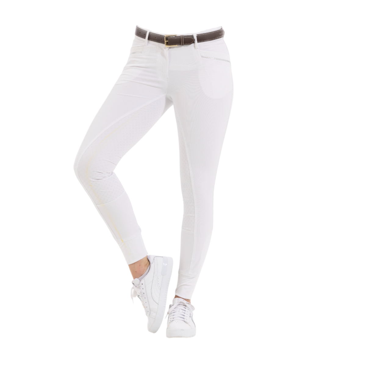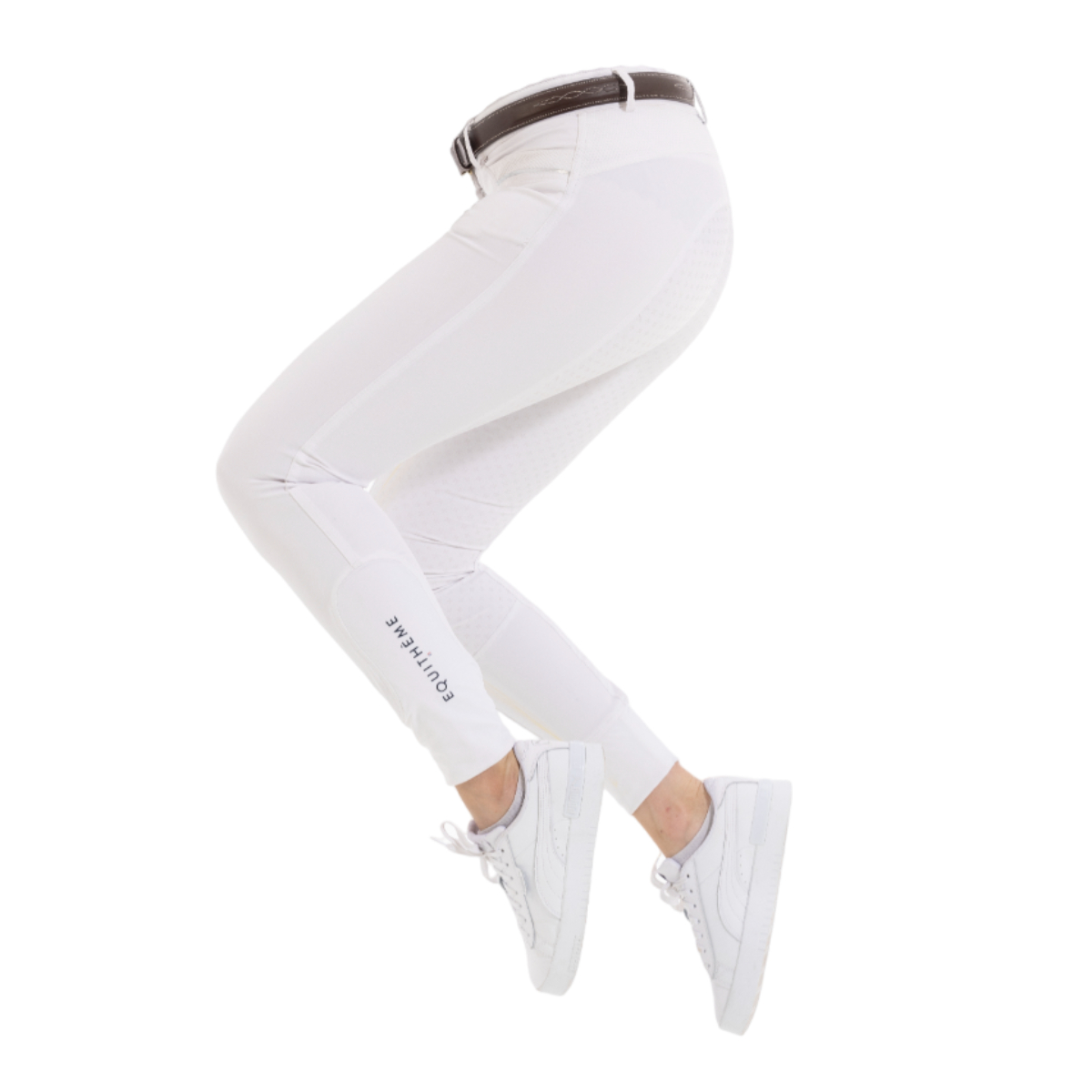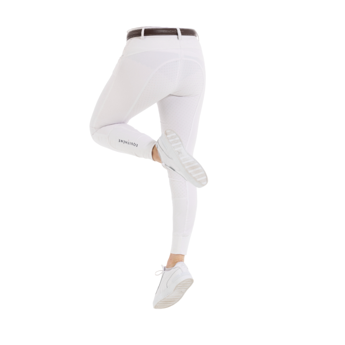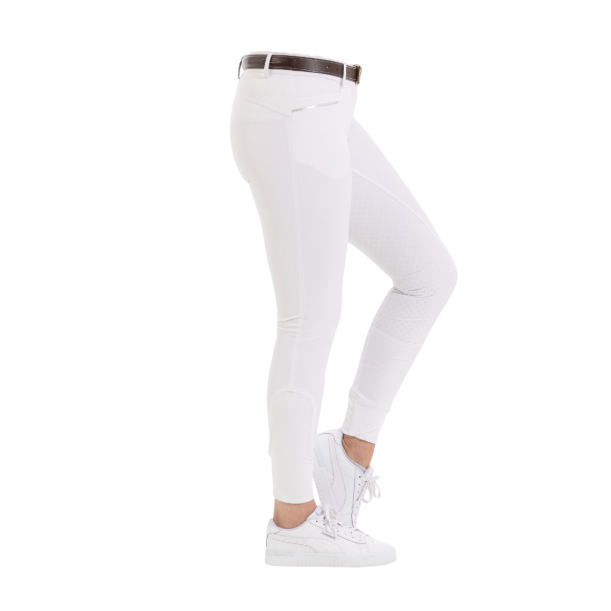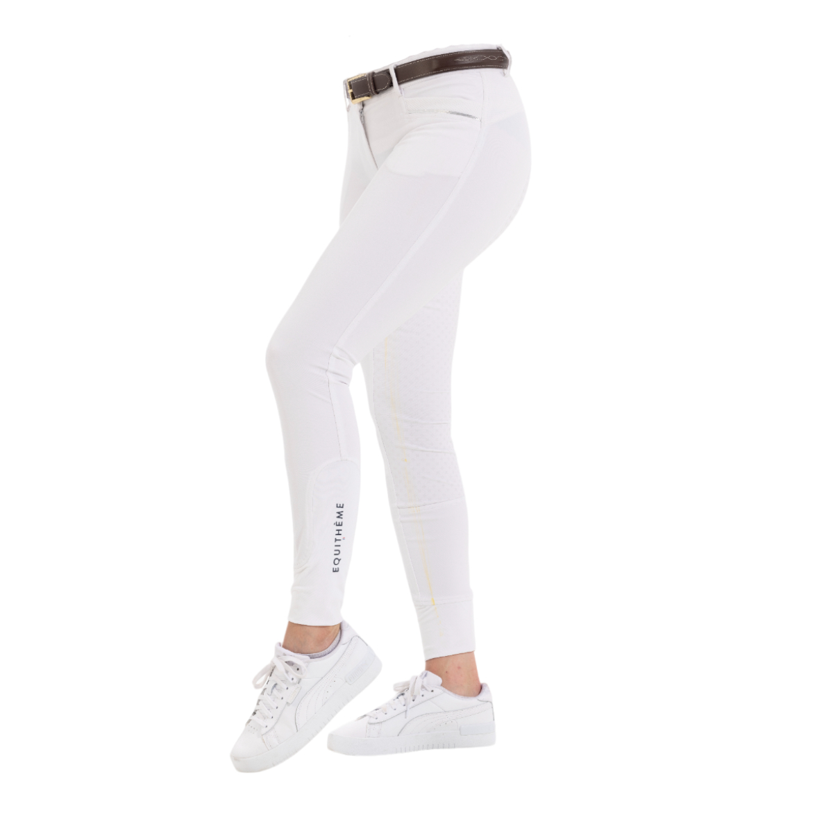 Женские бриджи с полной силиконовой леей (Riding Breeches with Silicone Patch). Смотрятся стильно благодаря окантовке карманов серебристой тесьмой. Силиконовая лея обеспечивает наибольшую фиксацию в седле. На поясе петли для ремня. Застёгиваются на молнию и брючный крючок. Имеются два кармана спереди. В области щиколотки имеются эластичные вставки с нанесенным логотипом "EQUITHEME" для удобства одевания.