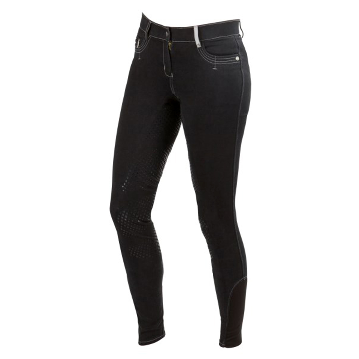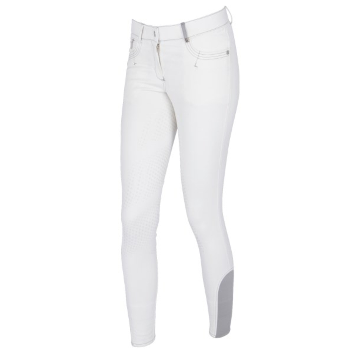 Стильные бриджи с полной силиконовой леей (Riding Breeches with Silicone Patch). Сделаны из плотной эластичной ткани, хорошо обтягивают фигуру и прекрасно сохраняют форму. На поясе петли для ремня. Два передних кармана, украшенных серой прострочкой. Застёгиваются на молнию и брючный крючок. В области щиколотки имеются эластичные вставки серого цвета для удобства одевания.