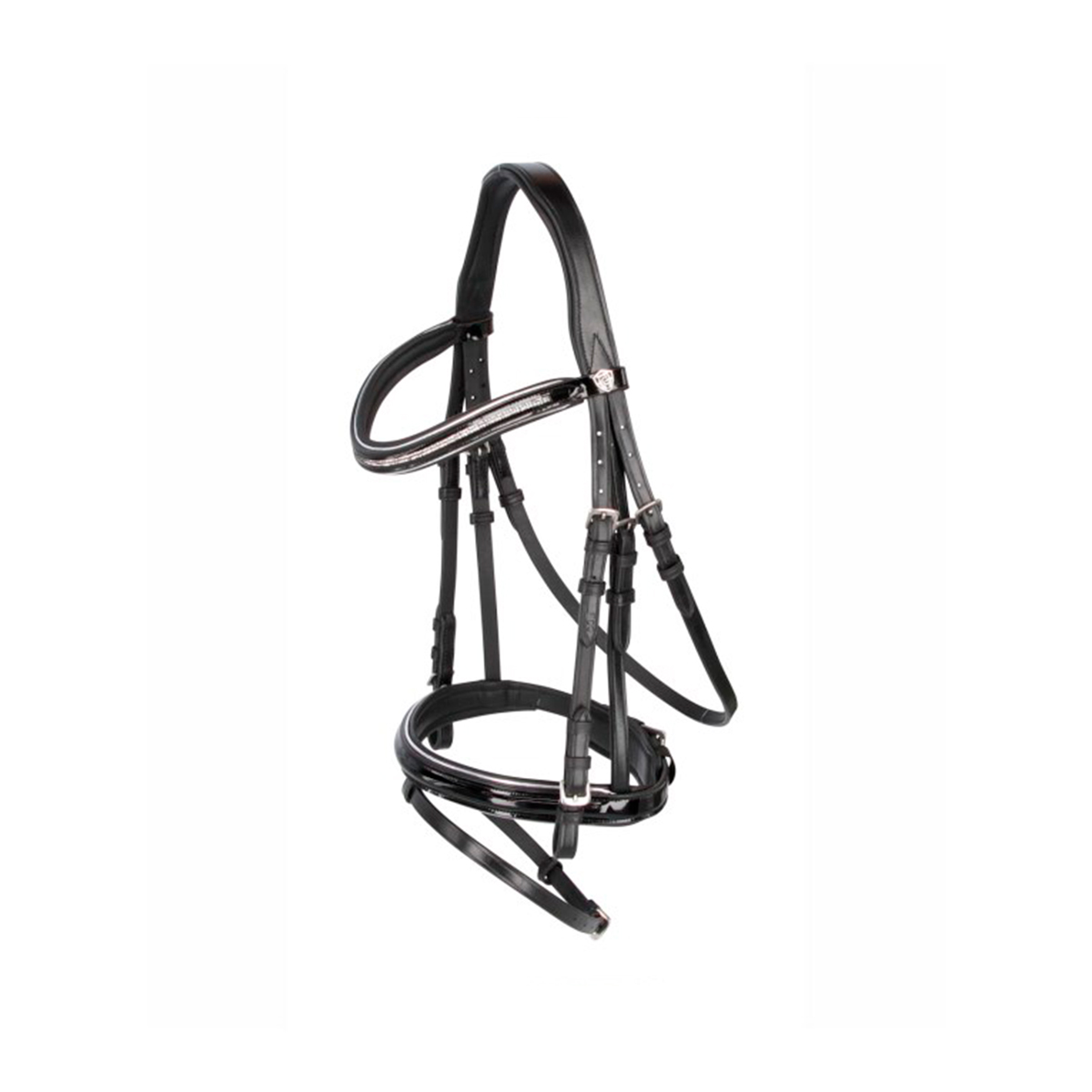 Классическая элегантное оголовье, выполненное из высококачественной кожи (Leather Bridle). Мягкие подложки на капсюле и налобном ремне делают уздечку комфортной даже для чувствительных лошадей. Также мягкая подложка есть и на затылочном ремне анатомической формы. Налобник украшен стразами. Металлическая фурнитура обработана специальным средством от ржавчины.