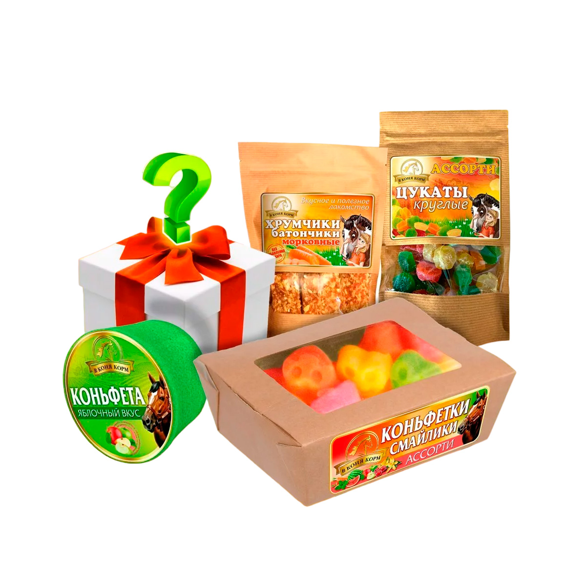Коньфета 620 г (вкус на выбор производителя) – 1 шт Цукаты круглые ассорти 200 г – 1 шт Смайлы 480 г (вкус на выбор производителя) – 1 шт Хрумчики 150 г (вкус на выбор производителя) – 1 шт Подарок-сюрприз (это может быть еще одно лакомство, сувенир конной тематики, миниатюра подкормки или косметического средства)