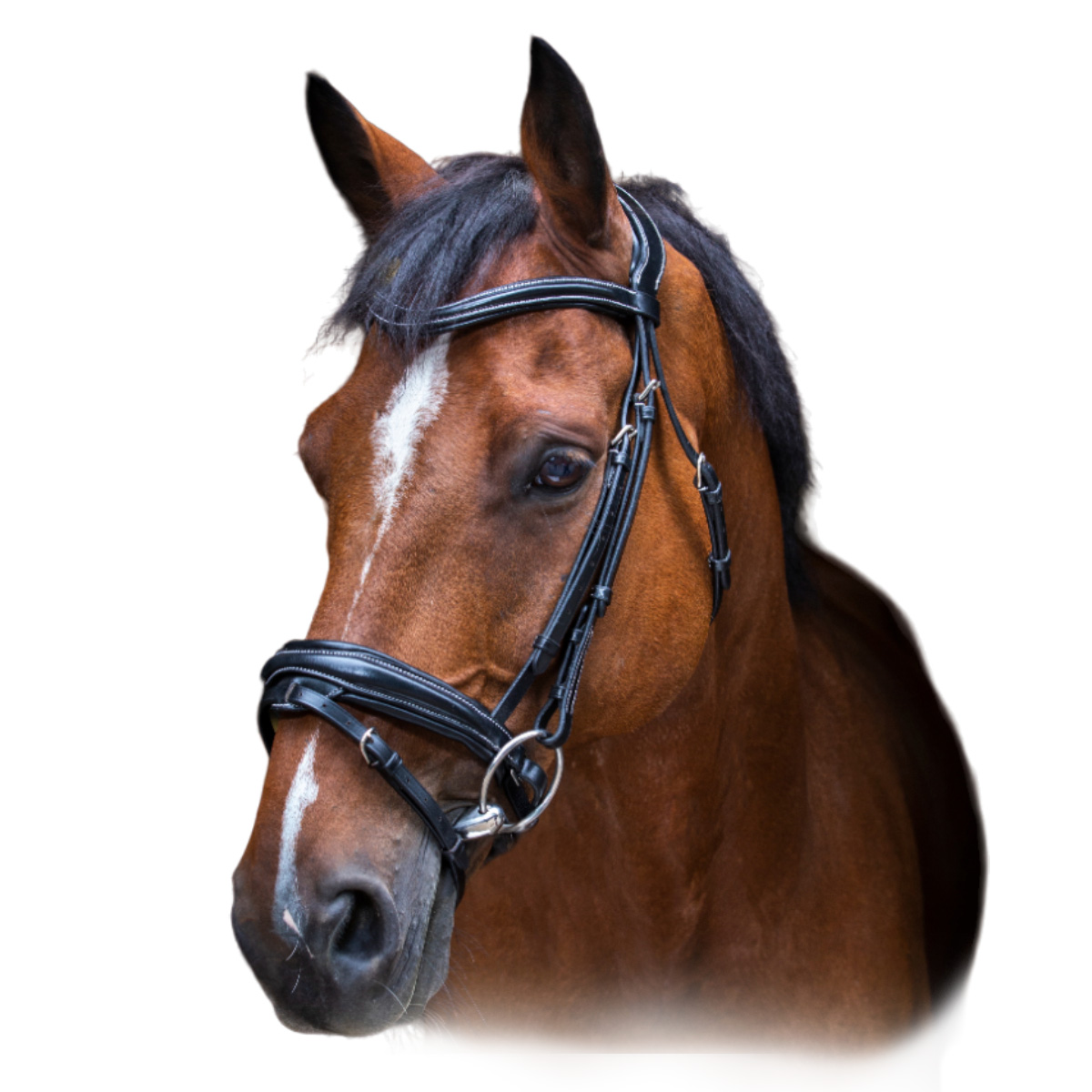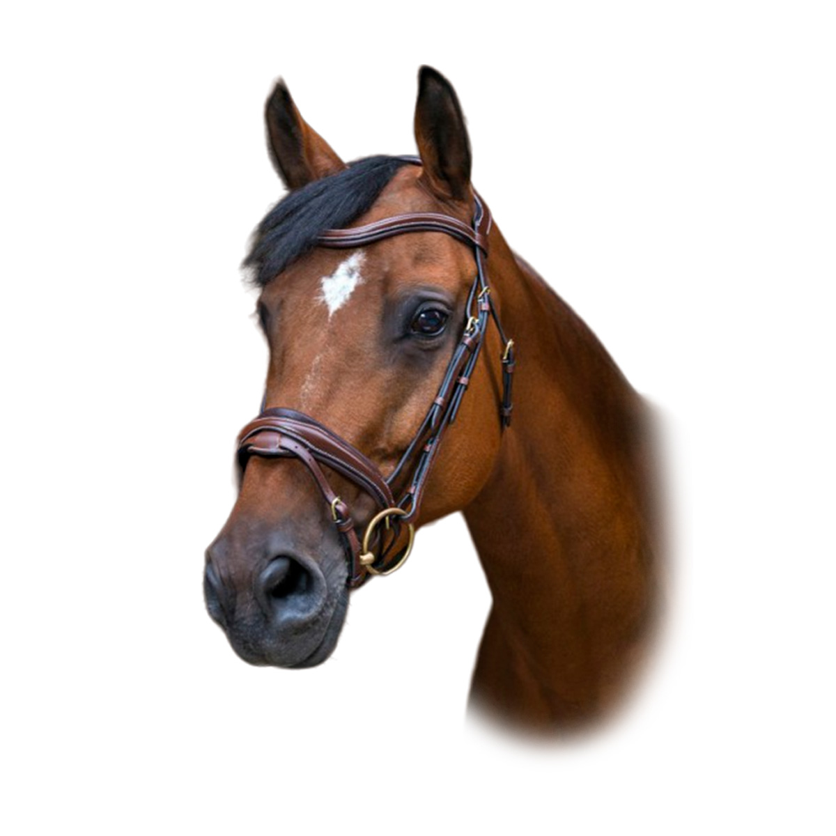 Оголовье из натуральной кожи (Leather Bridle) с широким фигурным затылочным ремнем анатомической формы. Оригинальный V-образный налобник. Капсюль с подкладкой из коровьей кожи для большего комфорта лошади. Оформлен контрастной белой строчкой. Поводья в комплект не входят.
