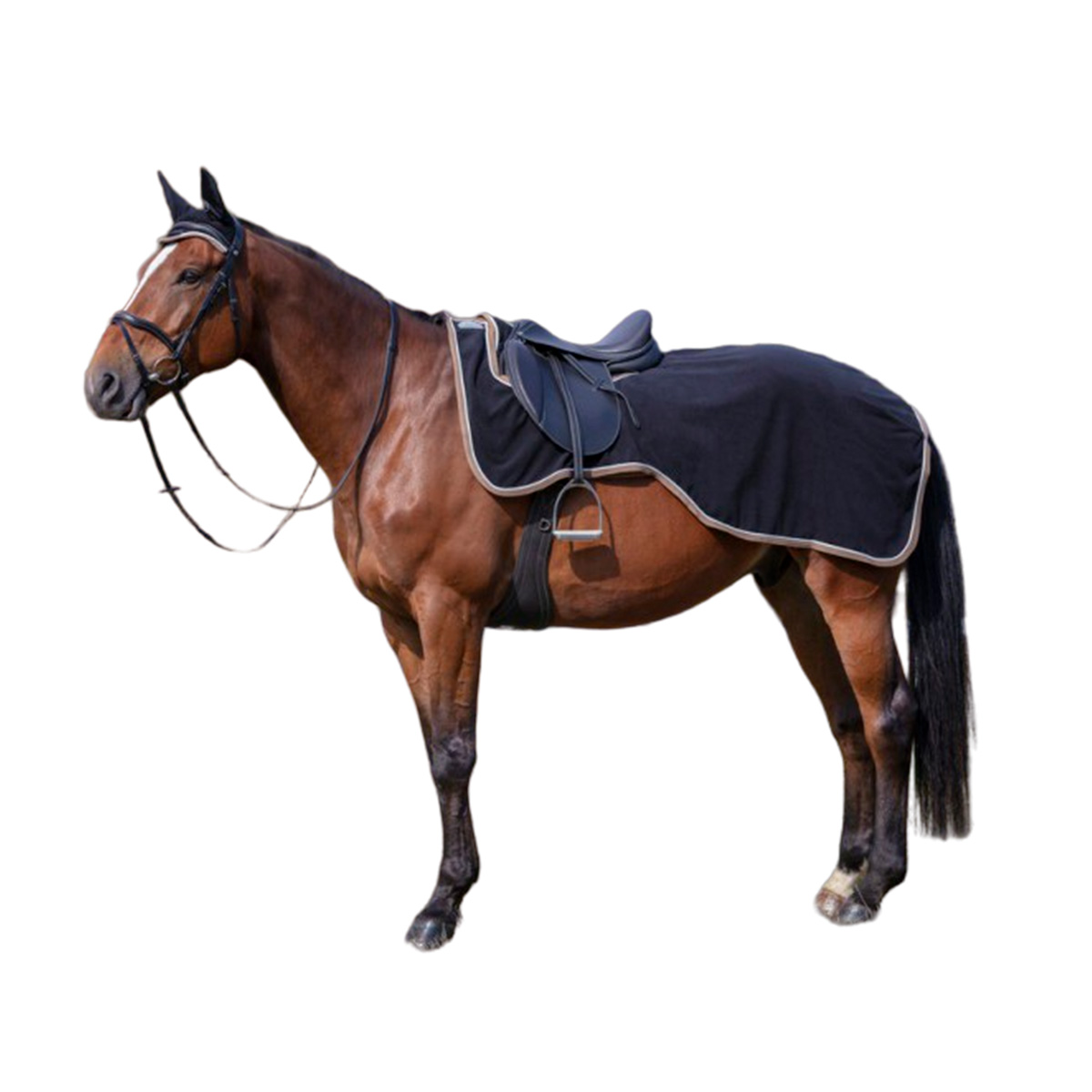 Полупопона флисовая с вырезом под седло. Украшена контрастной отделкой. Выполнена из мягкого полиэстра, 280 г/м². Материал попоны не скатывается и быстро сохнет. Имеется удобный ремень для хвоста и застежка-липучка под седло.
